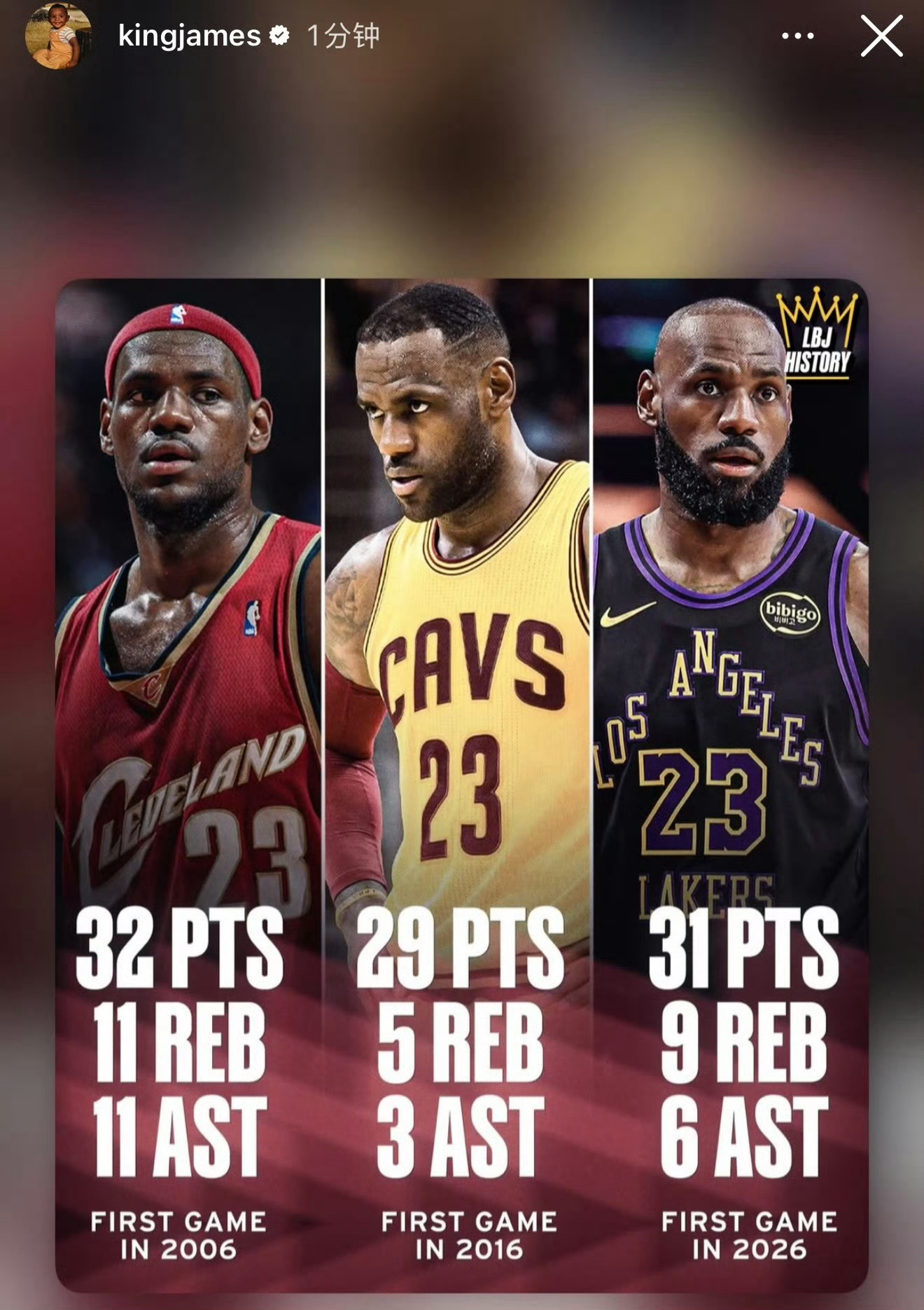 骑士克利夫兰骑士詹姆斯 人老了就是喜欢怀念过去图为詹姆斯分别在2006年、2016年、2026年的第一场比赛数据,这么看好像又还没老