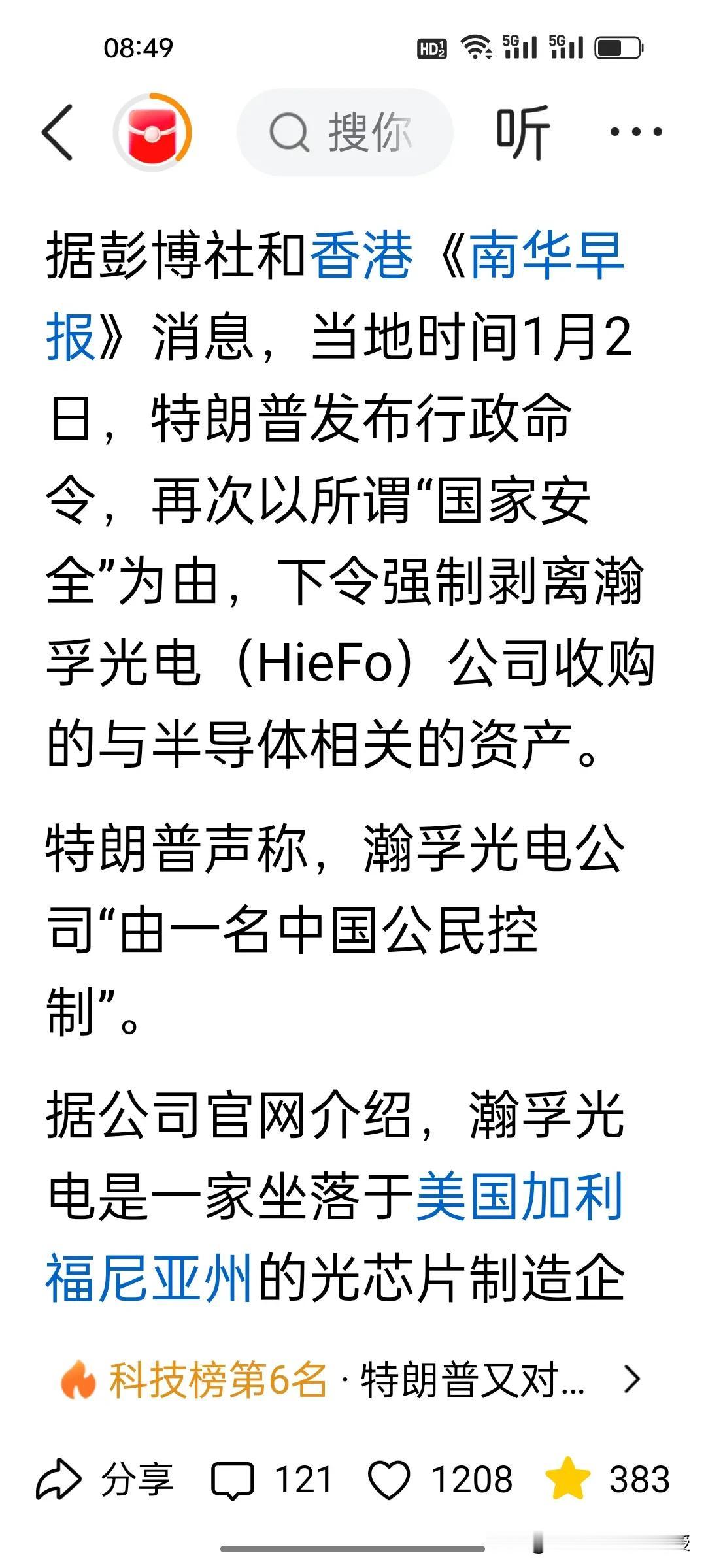 真的是霸权双杀!特朗普又对中国企业打压! 当全世界都在关注美国对委内瑞拉“擒首”的闪电行动时,不得不关注美国对中方的又一个霸权行径。 根据彭博社报道,当地时间1月2日签署行政令,以莫须有“国家安全”为由,强制由中国公民张根造任CEO的瀚孚光电,180天内剥离2024年收购的美企Emcore芯片资产,推翻这笔300万美元已完成交易。 美国的野心现在已经昭然若揭,背后5大核心图谋直指中国:泛化安全审查、切断技术协同、打压中企全球布局、重塑芯片产业链、遏制中国科技升级,中方必须高度警惕。 而特朗普去年12月31日晚在海湖庄园面对媒体记者说了新年愿望就是“愿世界和平”,还说了三遍,美军1月3日晚上就光速突袭委内瑞拉并逮捕总统夫妇的行动,更暴露其霸权无底线。 如今,美国从科技领域精准打压中资关联企业,到军事层面肆意践踏他国主权,美国根本无视国际法和任何法律约束,美方霸权行径只会愈演愈烈,毫无道义和信用可言,因此,打铁还需自身硬。中方需加速芯片自主突破、筑牢产业链防线,同时做好全方位应对准备,方能从容破局。