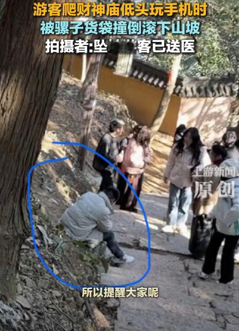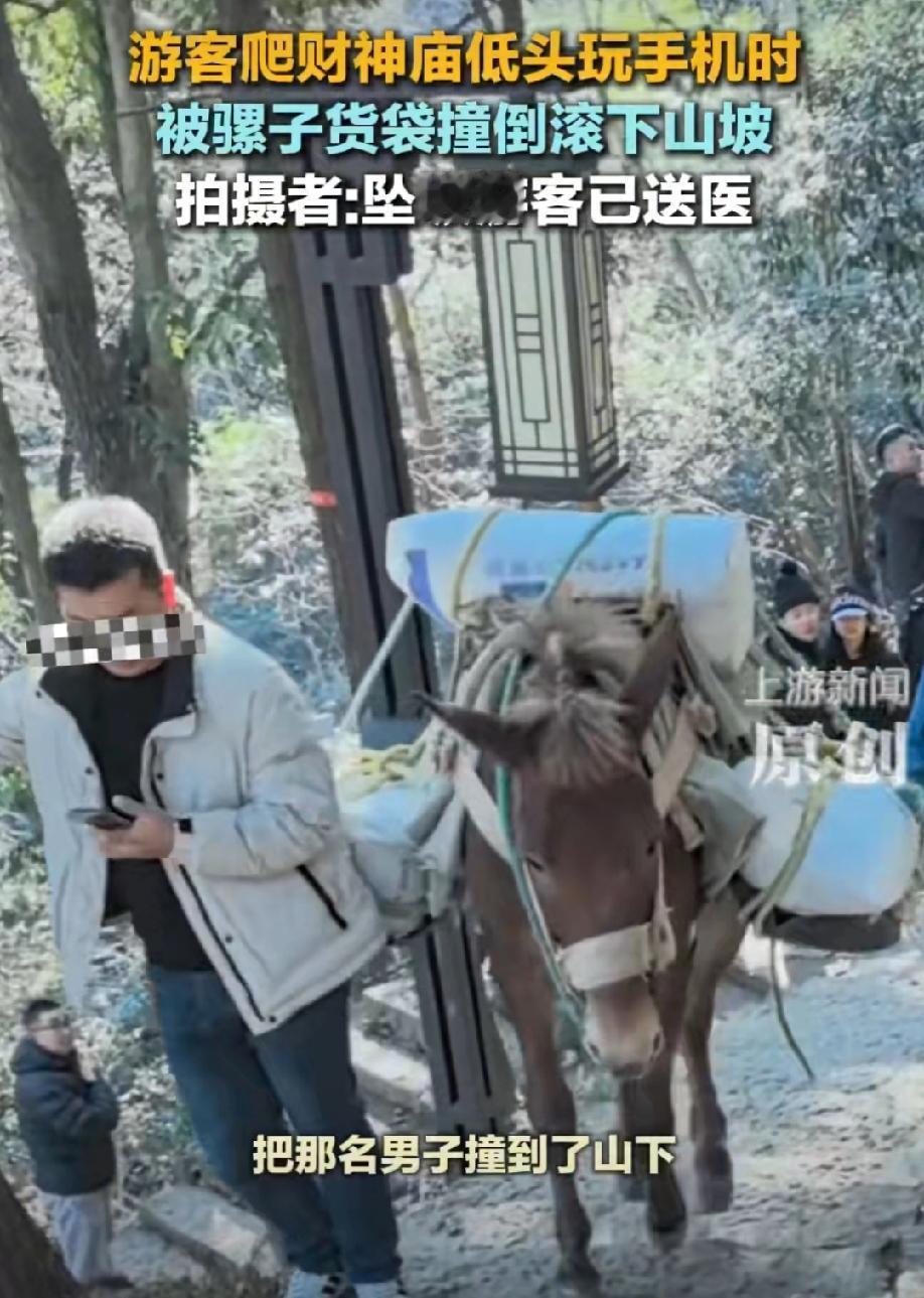 “解释不清了!”杭州一男子爬财神庙,低头玩手机时,被骡子货袋撞了下,结果,男子直接失去平衡,滚下了山坡,幸亏下面还有台阶,没有继续往下滚,要不然后果不堪设想,稍后被120拉走了。网友:不愧是天下第一财神庙,才到半山腰就来钱了! 杭州某财神庙的山道上,一个再寻常不过的周末突然闹出了动静。一个男的正埋头刷手机,旁边驮着货物的骡子经过时,背上沉甸甸的袋子直接撞上了他的肩膀。这人压根没防备,身子一歪就顺着山坡滚了下去,要不是下面刚好有台阶拦着,后果真不敢想。 周遭爬山之人皆惊愕失色,有人急忙掏出手机拨打120。所幸彼时恰有游客在拍摄骡子,将这一过程完整记录了下来。这段视频后来传到网上,评论区炸了锅,有人说"不愧是天下第一财神庙,才到半山腰就来钱了",黑色幽默里透着几分无奈。 财神庙的山路本来就不宽敞,平时游客多的时候人挨人往上挤,偶尔还会有骡子运送物资上下。这些牲口背着货袋在窄道上走,游客得随时留神避让才行。可现实是,多少人一边爬山一边低头盯着屏幕,脚步慢悠悠的,眼睛压根没往周围瞟。 那天骡子走近的时候,这男的还沉浸在手机里的内容,人声脚步声全都被他过滤掉了。货袋猛撞而来,力道惊人。他如同一袋沉重的谷物般,瞬间向侧边倾倒。手机“啪嗒”一声坠落在台阶上,紧接着,他的身体在碎石与杂草间翻滚,发出“咚咚”闷响。旁边的人想拉都来不及,只能眼睁睁看着他滚下去。 现在很多人出门在外,手离不开那块屏幕。走路之际不忘看,用餐之时亦紧盯,甚至如厕都要刷上两条。心中总揣着这般念头:“不过瞥一眼罢了,能有何事?”意外往往隐匿于侥幸心理之中。人们总在不经意间,怀揣着那丝虚妄的侥幸,却不知意外已悄然潜伏,伺机而动,打破看似安稳的现状。 有网友说"不就玩个手机吗,至于这么大惊小怪",这话听着轻巧,实际上分心陋习早就成了安全隐患。那部小小的手机承载不了生命的重量,一时疏忽可能要付出的代价远比想象中沉重。要是这男的当时抬头看一眼,注意到骡子过来主动让开,根本不会摔成这样。 这起意外看着偶然,其实是必然。手机成了注意力的小偷,把本该放在周围环境上的警惕心全吸走了。本怀着愉悦之心去祈福求安,不料竟躺于台阶之上苦等救护车。这不仅让身体饱受折磨,还沦为全网调侃对象。如此情形,着实得不偿失。 男的滚下山坡后停在台阶平台上,脸色发白看着起不来身。周围人赶紧围过去,有人问他的状况,有人已经在给120打电话。好在那截台阶刚好起了缓冲作用,没让他继续往更陡的地方滚,要不然轻则重伤,重则可能危及性命。 更关键的是,当时正好有游客拍下了完整经过。要是没这段视频,事后还真说不清楚——被骡子撞滚下山坡,说出去谁信?搞不好还得被误会是自己不小心摔的,想找说法都没处找,有嘴也说不清。多亏人多眼杂,来龙去脉才算有了证据。 须臾之间,救护车疾驰而至。医护人员迅速检查伤者伤势,而后小心翼翼地将其抬上担架,动作娴熟且轻柔,旋即送往医院,争分夺秒与时间赛跑。旁人并不明晰他具体伤势如何。那状况仿若迷雾,难以窥得全貌。大家唯有在心底默默祈愿,盼他吉人天相,并无大碍。 这事给所有人提了个醒:不管是爬山还是在外面走动,别总让手机绑住注意力。山道这种本身就有安全隐患的地方,分心一秒都可能出意外。抬头看看周围环境,留意身边动静,既是对自己负责,也能好好感受当下的风景。 别让低头遮住了眼前的路,更别让疏忽毁掉本该快乐的时光。唯有将注意力精准倾注于应聚焦之处,方能深度领略生活潜藏的美好。抛却旁骛纷扰,专注当下,生活的绮丽画卷自会为你徐徐展开。毕竟那些碎石、杂草、台阶,可不会等你刷完手机再出现。