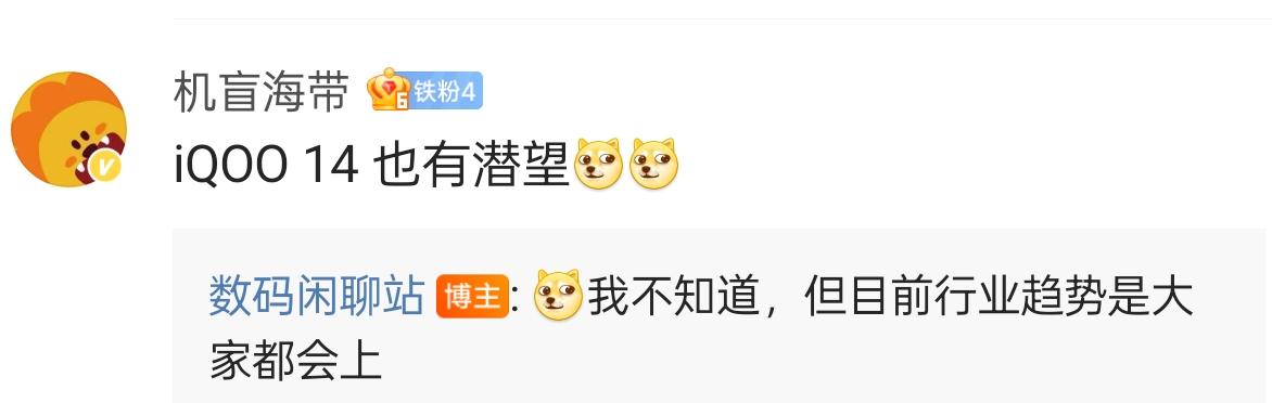 iQOO 14或配备潜望镜头! 今日,数码闲聊站博主透露,SM8850迭代线有概率全系配备潜望镜头。用户“白马过平川_1”表示,这还不确定,因为现在还没进PVT阶段,大概得明年Q2确定。 此外,还有用户调侃道:“真跟苹果学到精髓了,每年只更大一个大功能。”博主回应称:“那不会,安卓机挤牙膏~褒姒。” 另一位用户“机盲海带”则表示:“iQOO 14也有潜望镜头。”对此,博主表示:“我不知道,但目前行业趋势是大家都会上。” 欢迎友友在评论区留言讨论,分享看法,点赞收藏加关注支持一下,你们的支持是我更新的最大动力,谢谢啦!爆料