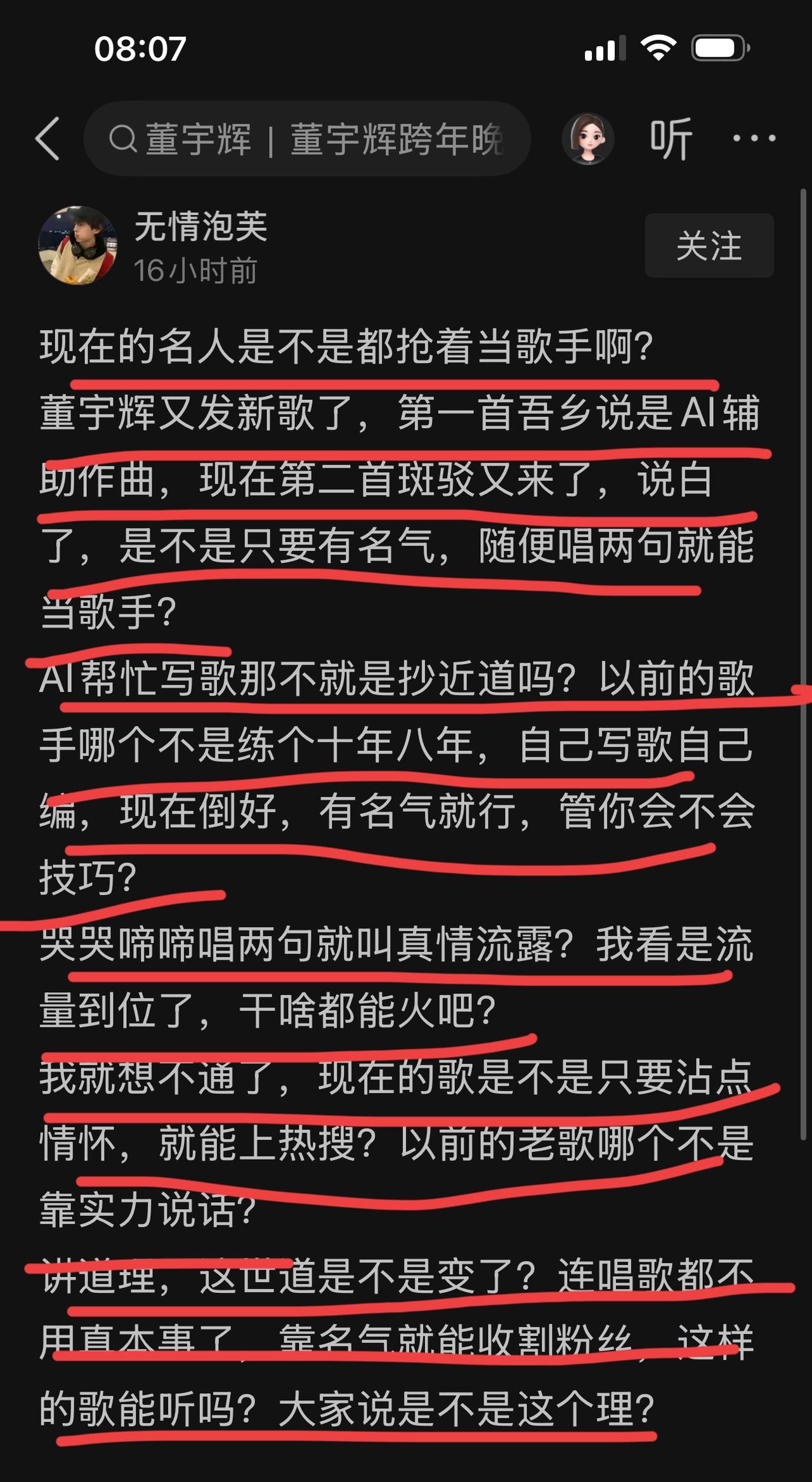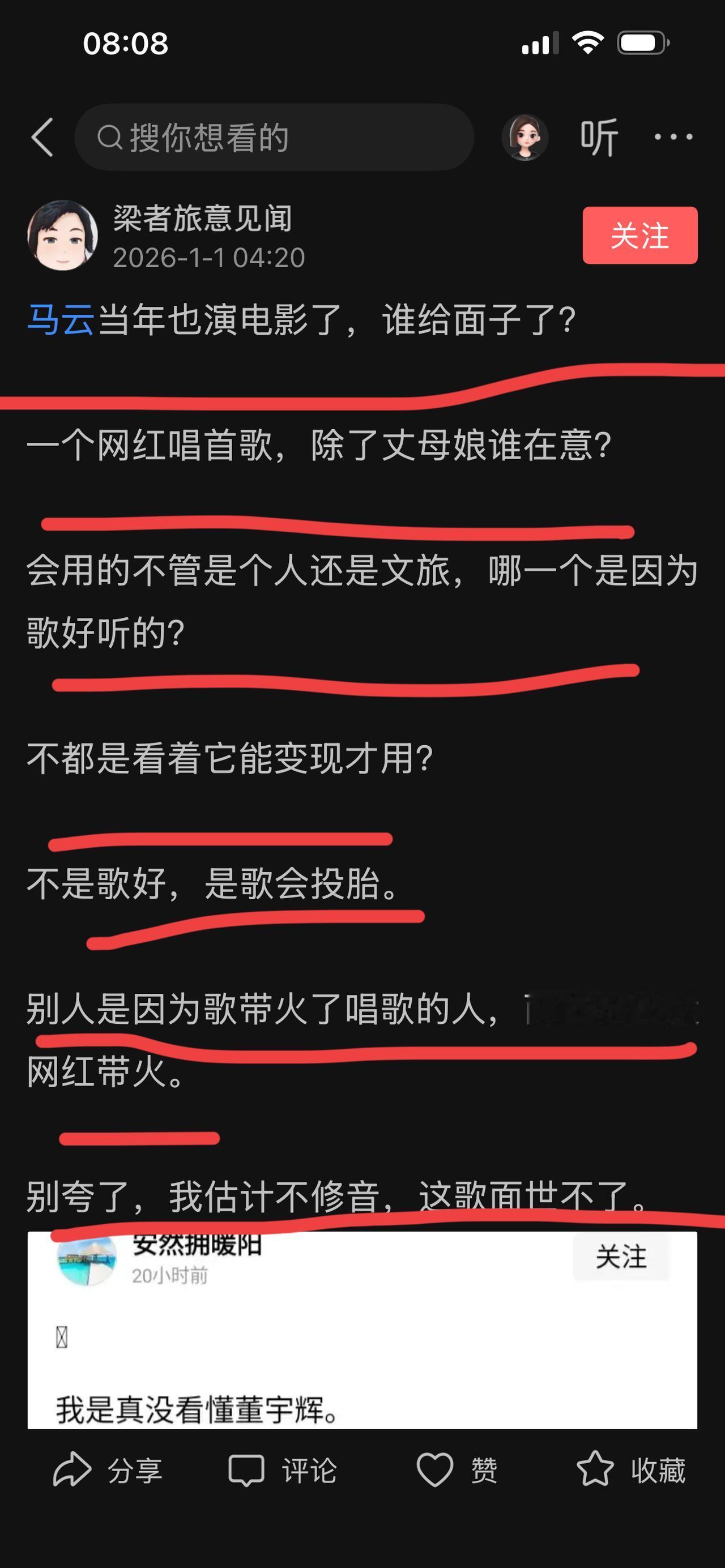 董宇辉的第二首原创歌曲《斑驳》又火了, 首发后的24小时播放量破千万, 成了全网循环BGM。 多家文旅账号转发, 这几天热度一直不停, 又带动了歌曲的第二次传播, 反正我这几天点赞转发不知道多少文旅的视频了。 歌曲火了, 键盘侠不乐意了。 他们酸的不行, 说之所以火爆, 不是歌好, 而是投的胎好。[大笑][大笑] 虽然你是想拉踩, 但是这话怎么听起来是在夸宇辉呢? 夸他可以把一首不优秀的歌给唱火了 。 呵呵呵, 你这是夸董宇辉就是这么招人喜欢吧。 至于质疑这首歌的歌词和唱功, 有必要吗? 董宇辉又不是专业歌手, 不靠这赚钱。 歌曲被各地文旅二创转发, 这一来是董宇辉的肯定, 二来是这首歌文旅可以免版权费使用。 不谈歌曲本身, 就目前董宇辉的人气和热度, 能把自己的原创歌曲免费给文旅使用, 试问这格局, 能有几人? 如果是你们, 能做到吗? 质疑什么AI写歌, 没必要这样酸吧。 AI你们不会用吗? 你们也可以去写, 写好了也可以去唱, 一天十首都可以, 说不定下一个出圈的就是你。 是啊,这个流量为王的时代, 能够有流量变现就是王者, 如果有机会, 你们肯定也不愿意放过机会。 你们写这么多酸文, 还不是把自己的流量变现。 不同的是董宇辉的流量值钱, 你们的流量只值五毛钱。 散会! 董宇辉