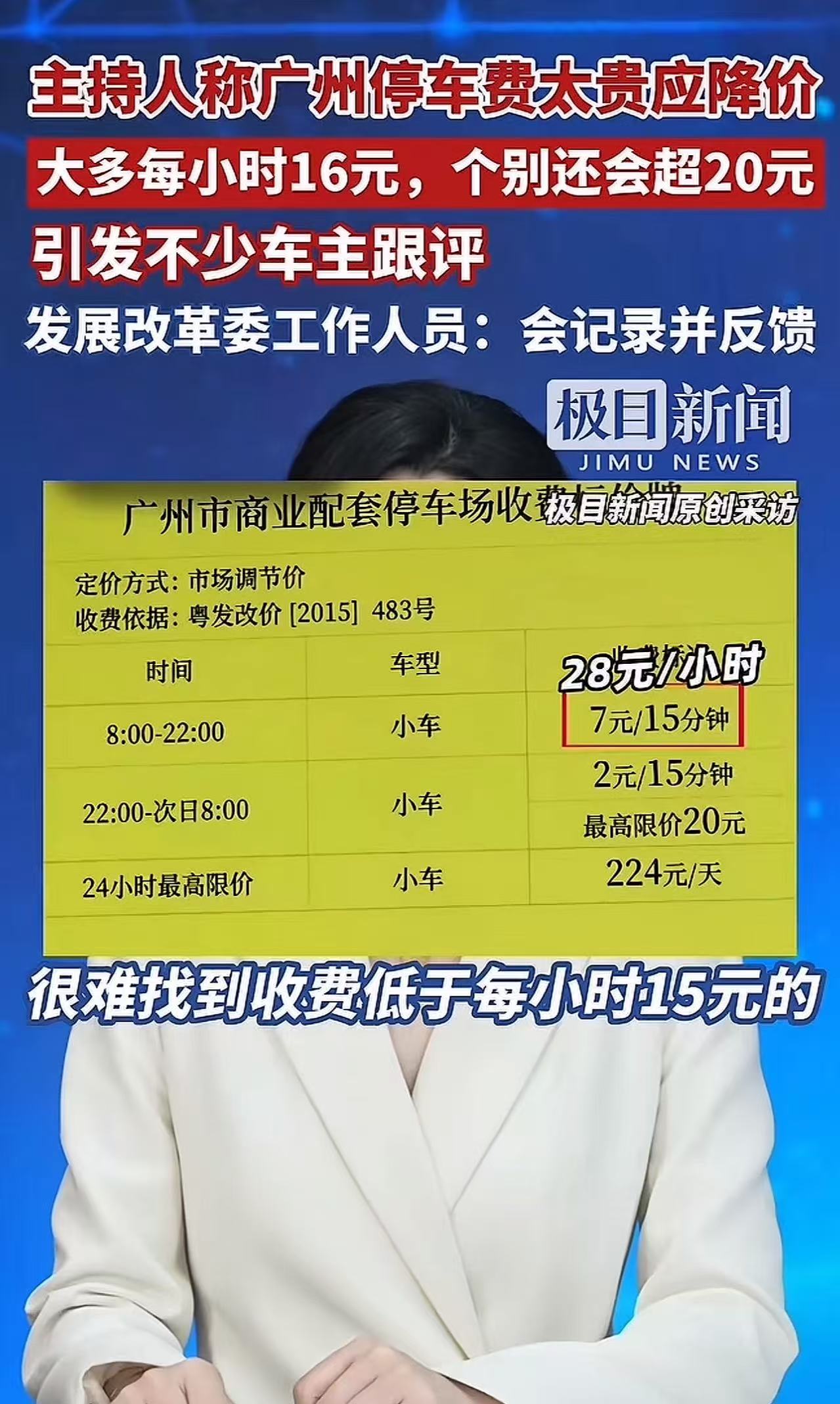 这名主持人说:“以广州的核心商圈为例,那停车费简直高得让人咋舌。想要找到收费低于每小时15元的停车位,那简直比登天还难,基本每小时都是16元起步,个别地方的收费甚至还会超过20元,而且有的停车场收费还不封顶,这费用就像坐了火箭一样蹭蹭往上涨。实在承受不起。”