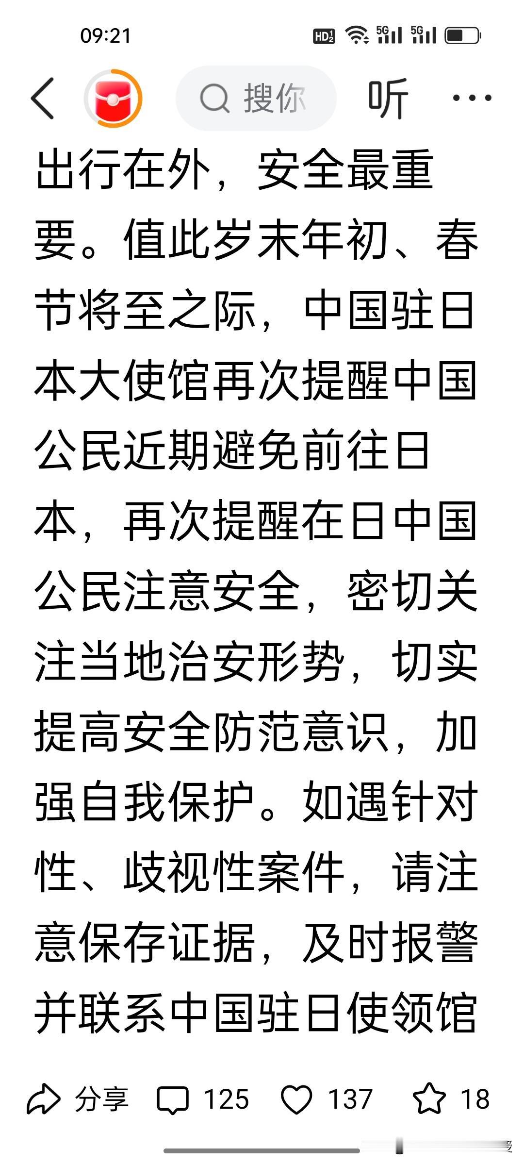 日本东京恶意伤害中国人的事件仍在发生。刚刚看到《每日经济新闻》报道,两名中国人在东京新宿区被车辆严重撞伤。日本人报复社会,针对中国公民的袭击行为仍屡有发生。中国驻日大使馆再次提醒中国公民不要去日本。 当前赴日航班减少了40%,中国游客从去年10月份到11月份骤降了21.4%。 高市早苗对中国的挑衅发言至今没有公开道歉,但是高市早苗在日本年轻人中的支持率很高,据2025年12月20-21日《产经新闻》与富士新闻网(FNN)联合民调,日本18-29岁年轻人对高市早苗内阁的支持率达92.4%,同期内阁整体支持率75.9%,这也加剧了日本人对中国人的仇恨。 祖国的大好河山浏览不尽,滑雪地也不胜枚举,新春佳节来临之际,我们根本没有必要冒着生命危险去日本旅游。