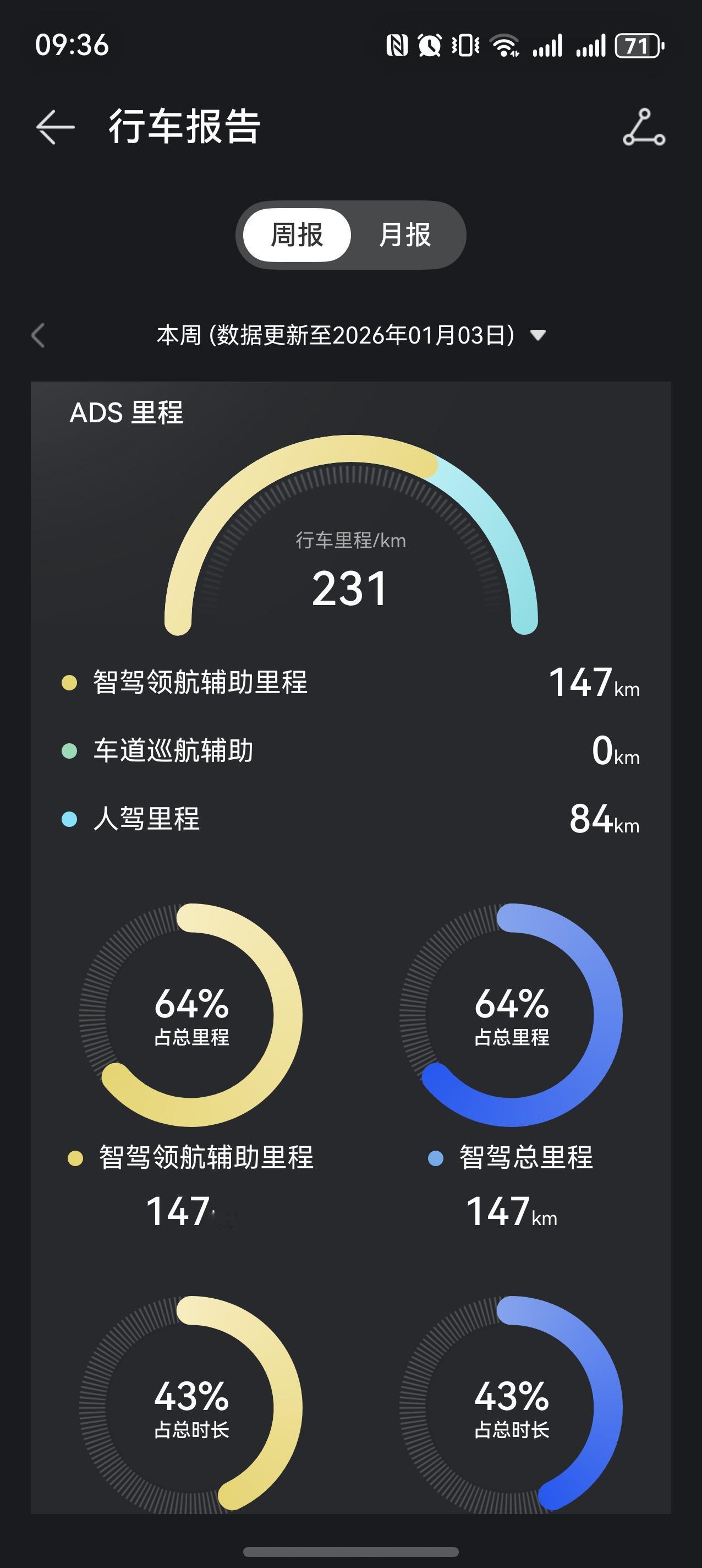 看了一下这几周的数据,智驾的比例是逐步升高的,因为绝大部分场景确实很好用。泊车就