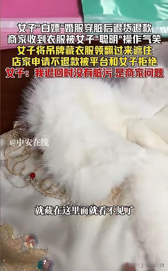 “活不起了!”,近日,安徽,一女子网购了件婚服,婚礼结束后便申请退货退款,商家收到后,发现女子用别针将吊牌藏在了看不见的地方,而且衣服上还有明显污渍,最后商家气不过,申请不退款,结果被平台和女子拒绝。网友:太丢人了! 事情的起因很简单,这位女子婚期临近,就在网上买了一件价格不菲的婚服,收到货后试穿效果不错,按理说大多数准新娘都会满心欢喜地剪掉吊牌,安心备婚,可她却觉得婚服就穿一次,花这么多钱买下来太不划算,心里打着“只穿不买”的算盘,琢磨着怎么既能风光出嫁,又能事后全额退款。 为了钻平台“七天无理由退换货”的空子,她盯上了象征商品全新的吊牌,一般人退货要保持吊牌完好,可她既不想剪断吊牌挂绳,又要让穿的时候看不出痕迹,就找了一枚别针动起了手脚。 你说这事儿闹的!婚礼本是人生最该体面的时刻,穿的是喜庆,图的是圆满,可这位准新娘却把心思用错了地方,真是捡了芝麻丢了西瓜。别针藏吊牌的操作看着“聪明”,实则透着一股算计的寒酸,衣服上的污渍擦不掉,心里的诚信污点更洗不干净! 商家卖一件婚服不容易,从设计、制作到发货,每一环都要投入成本,尤其是定制款或价格偏高的款式,本来就没多少利润空间。收到退回的脏衣服时,那种委屈和愤怒可想而知——好好的新衣服变成了“二手婚服”,污渍渗进面料,别说二次销售,就算清洗修复都要额外花钱,这损失到头来还得商家自己扛? 更让人费解的是平台的态度,“七天无理由退换货”的初衷是保障消费者合法权益,比如商品质量有问题、尺码不合适,可绝不包括这种“穿完就退”的恶意消费。女子明明破坏了商品完整性,平台却站在她这边,这不是变相纵容投机取巧吗?长此以往,商家只能被迫提高售价、收紧退货政策,最后吃亏的还是普通消费者。 有人说“谁的钱都不是大风刮来的”,婚服穿一次确实可惜,但省钱不能没底线。古代经商讲究“童叟无欺”,现代社会更看重诚信为本,哪怕是网购,也该守住基本的道德底线。你想省钱,完全可以租婚服、买二手婚服,或者选性价比高的款式,没必要用这种不光彩的手段,让自己的婚礼蒙上阴影。 再说了,婚礼的意义在于两个人的相守承诺,不在于一件衣服穿得有多贵、退得有多“精明”。当你穿着偷偷藏起吊牌的婚服走进礼堂时,心里难道就没有一丝不安?这种投机取巧的行为,不仅丢了自己的脸面,也辜负了商家的信任,更给这场本该纯粹的婚礼添了堵。 诚信从来都不是小事,它藏在每一次消费里,躲在每一个选择中。你以为钻了规则的空子是赚了,其实是丢了最宝贵的人品。商家不容易,平台也该守住底线,不能让恶意退货者肆无忌惮,更不能让诚信经营者寒了心。 各位读者你们怎么看?欢迎在评论区讨论。
