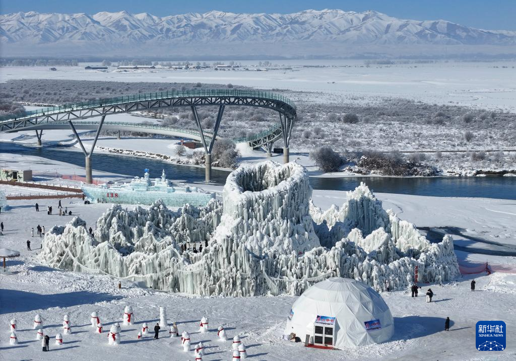 1月3日,游客在新疆昭苏县冰雪乐园游玩(无人机照片)。新华社记者胡虎虎摄