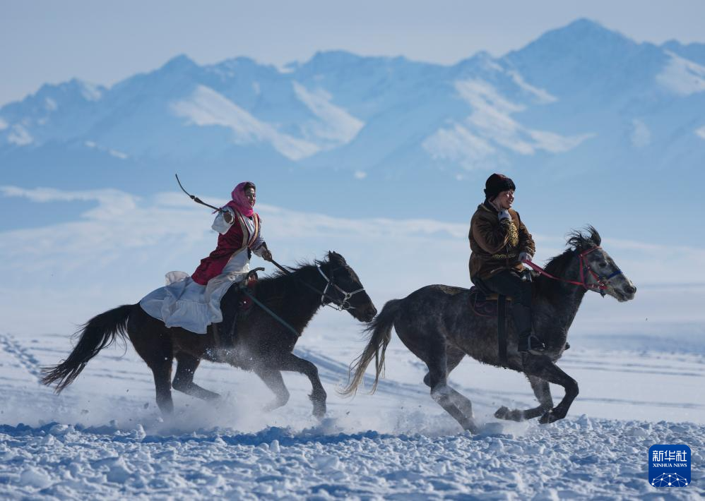 1月3日,牧民在新疆昭苏湿地公园为游客表演。新华社记者胡虎虎摄