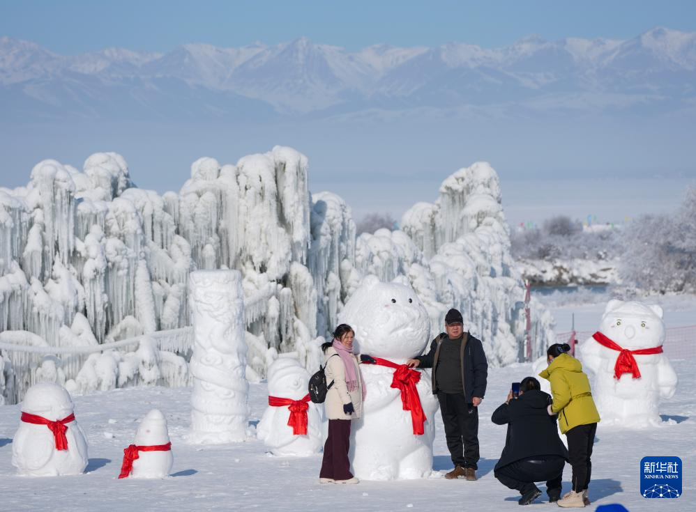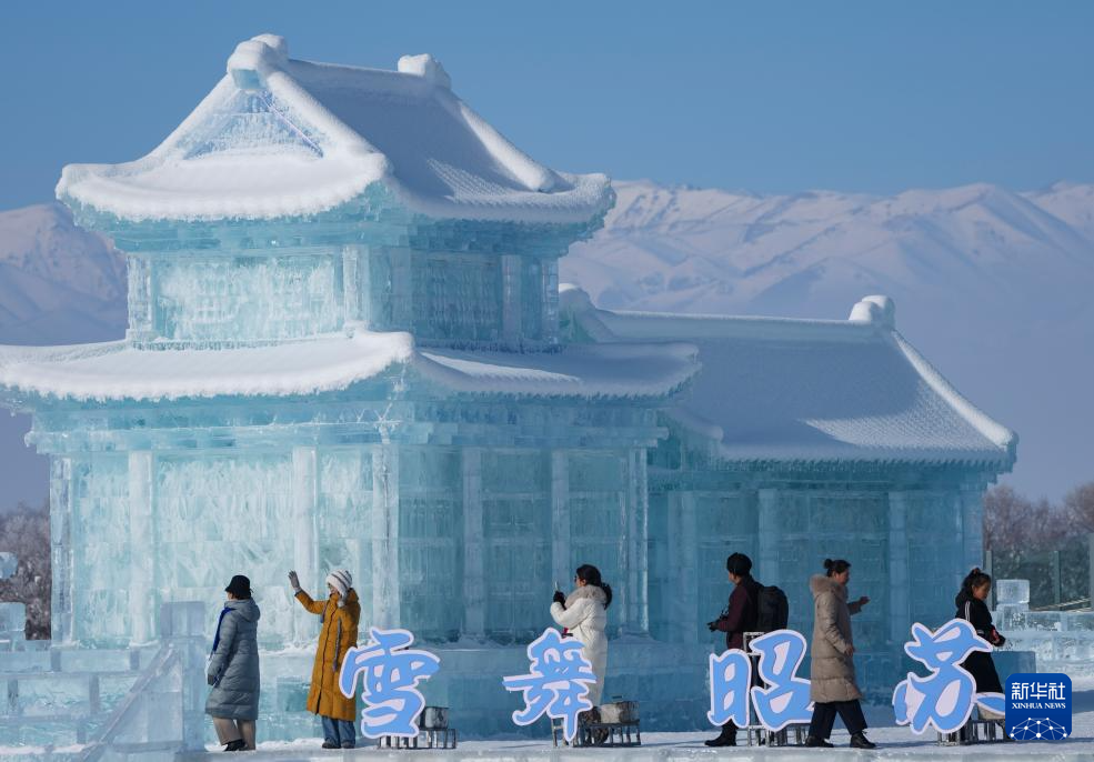 1月3日,游客在新疆昭苏县冰雪乐园参观冰雕作品。新华社记者胡虎虎摄