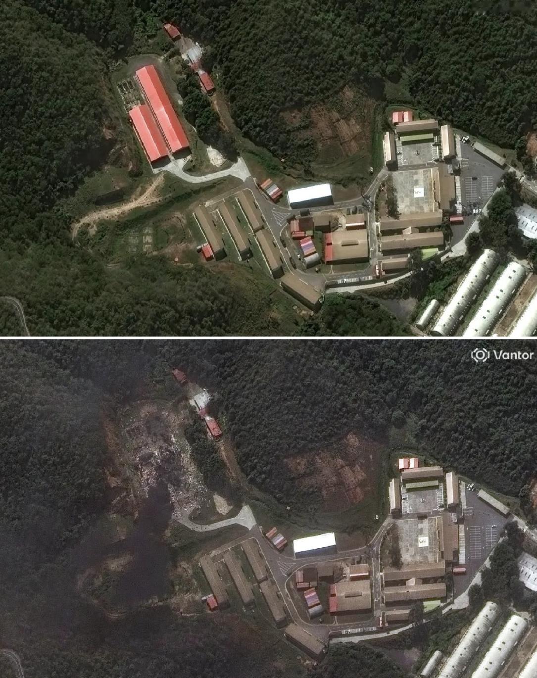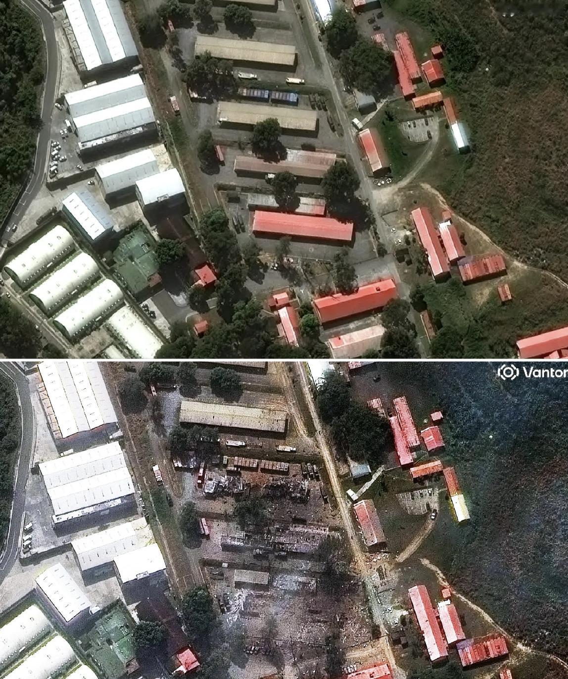 马杜罗的总统府,美军是一枚导弹都没有投,这说明美军是完全掌握了马杜罗的行踪。 再看看图二和图三,是马杜罗当时藏身的一处军事基地。 美军对这处军事基地的袭击,也是针对性很强,其余建筑一处没炸,击中轰炸了其中几处红色屋顶的建筑。 马杜罗的踪迹被美国掌握的如此精确,那就不仅仅是有内鬼的问题了,而且这个内鬼要么身居高位,要么就在马杜罗身边。