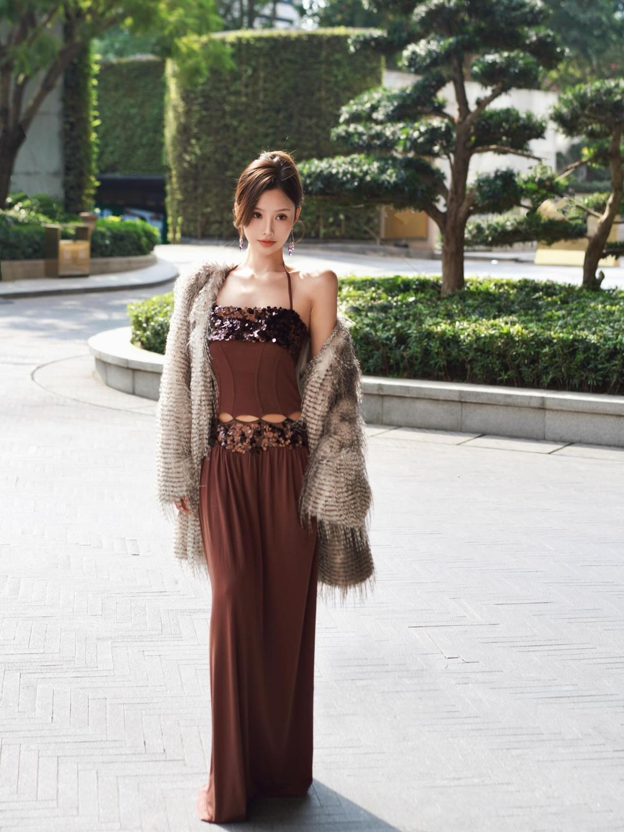 优雅复古风,棕色亮片连衣裙,搭配毛绒外套,尽显时尚魅力!