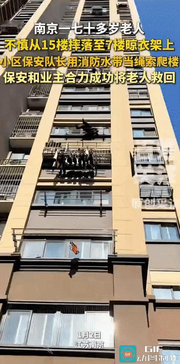 “惊魂一刻!”江苏南京,一名七旬老人不慎从15楼家中坠落,幸运的是被7楼窗外的晾衣架接住,悬挂在约20米高空。惊慌的居民仰头望着摇摇欲坠的老人和发出金属扭曲声的晾衣架。就在这千钧一发之际,小区保安队长奋不顾身,用消防水带当绳索爬楼施救,最终成功将老人从死神手中夺回! 来源:【百姓关注】 当天中午,当地一小区小区突然传来一声闷响。在15号楼,一名70多岁的老人不慎从自家坠落,在重力作用下急速下坠! 就在这千钧一发的时刻,7楼窗外伸出的晾衣架意外地拦截住了下坠的身体。老人仰面被卡在金属晾衣架上,晾衣架因巨大的冲击力而变形扭曲! 此时距离地面约20米,这个高度相当于普通住宅楼的7层。悬挂在空中的老人随时可能因体力不支或晾衣架断裂而再次坠落! 小区物业安保队长接到通知后迅速赶到现场。面对紧闭的7楼大门和装有防盗窗的下方楼层,这位32岁的退役军人果断决定从上往下救援! 他从8楼居民家中将消防水带绑在自己身上,在两名同事和8楼住户的协助下,抓住窗沿从8楼爬向7楼! “爬下楼救人只用了一分钟左右,因为对老人和自己来说都要尽快完成。”保安队长事后回忆道。消防水带是现场唯一的安全措施,他没有考虑个人安危,只担心救援过程中老人会从晾衣架上滚落! 最后,保安队长成功将老人从晾衣架上抱回7楼室内,随后120急救人员迅速将老人送往医院。小区物业负责人陈先生表示,老人目前意识清醒,正在医院接受治疗! 小区楼下,被救老人家属紧握着队长的手,感激之情溢于言表。这位退役军人只是摆摆手,转身继续他的日常工作! 在另一小区,某住户特意加固了自家窗外的晾衣架。而物业办公室内,陈先生正计划组织一次高空作业安全培训! 阳光下,那些看似普通的晾衣架静静伸出窗外,它们将继续悬在城市的半空中,既是生活的寻常风景,也可能在某个危急时刻,成为生命的最后防线!