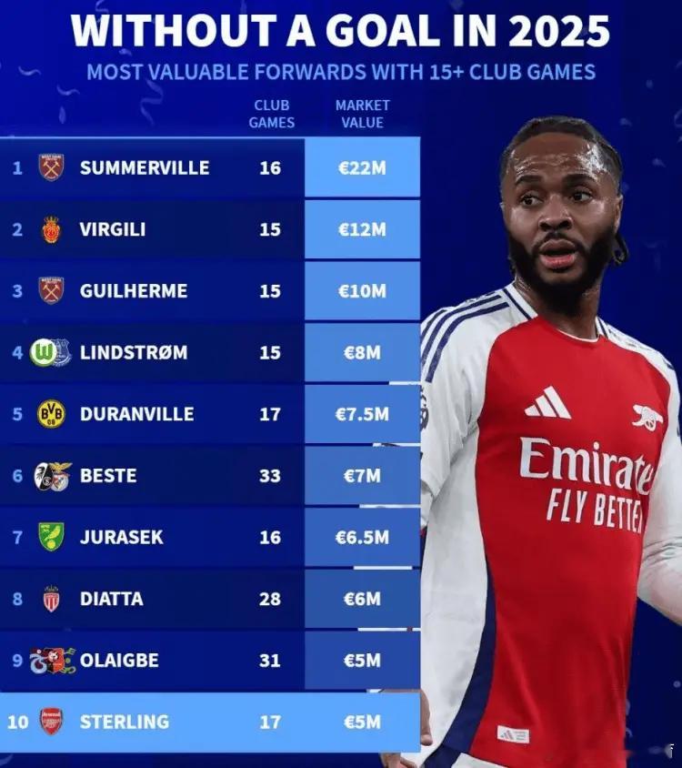去年出场15+但0球前锋身价:萨默维尔居首,杜兰维尔、斯特林在列1月4日讯 2025年已经过去,多位知名前锋一整年均未能取得进球,《转会市场》也统计了在俱乐部出场15+但0进球的球员身价榜。去年出场15+但0进球前锋身价榜:欧元1. 萨默维尔(西汉姆联), 16场, 2200万2. 哈恩·比尔希利(皇家马洛卡), 15场, 1200万3. 吉列尔梅(西汉姆联), 15场, 1000万4. 林德斯特伦(沃尔夫斯堡、埃弗顿), 15场, 800万5. 杜兰维尔(多特蒙德), 17场, 750万6. 扬·尼克拉斯·贝斯特(弗赖堡、本菲卡), 33场, 700万7. 马特伊·尤拉塞克(诺维奇), 16场, 650万8. 迪亚塔(摩纳哥), 28场, 600万9. 卡西姆·奥拉格贝(雷恩、特拉布宗体育、色格拉布鲁日), 31场, 500万10. 斯特林(阿森纳。切尔西未出场), 17场, 500万