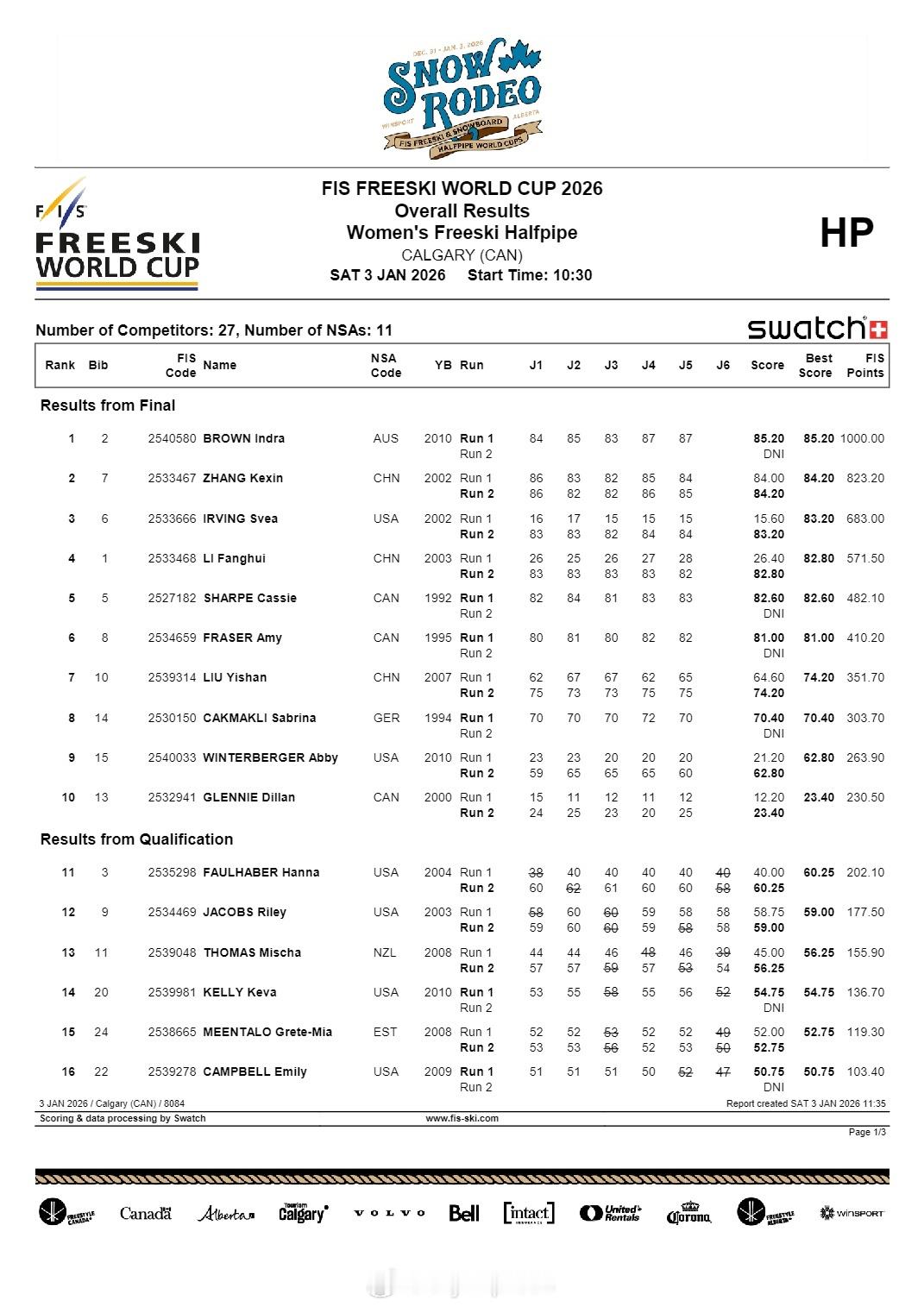 【自由式滑雪世界杯张可欣摘银】国际体坛战报速递 1月3日卡尔加里,自由式滑雪世界杯U型池加拿大站比赛结束,中国选手张可欣以84.20分夺得银牌。澳大利亚15岁小将布朗以1分优势首次登顶世界杯,美国厄文落后张可欣1分摘得铜牌。资格赛排名榜首的李方慧名列第四,刘奕杉排名第七。
