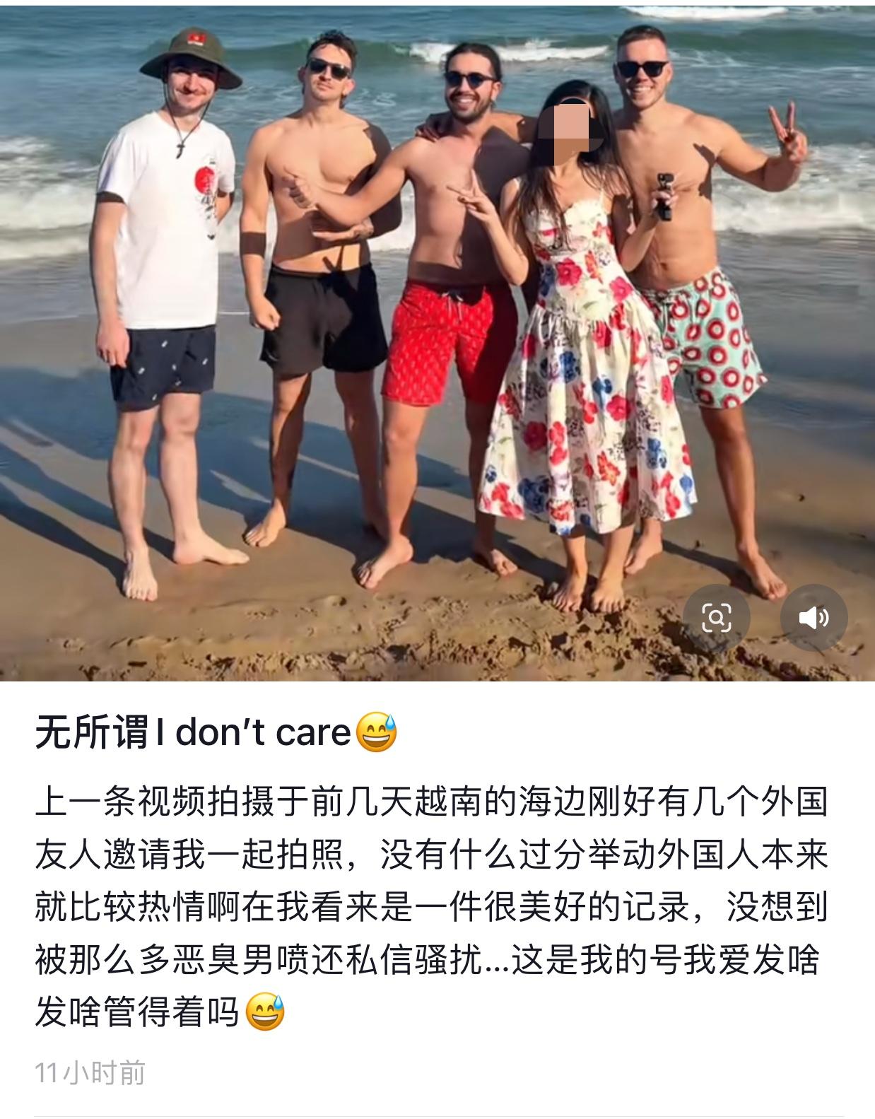 不是恋人却胜似恋人…. 近日,一个广东IP的女孩去越南旅游,在海边游玩时,遇到几个外国人男子,这几个外国男子就邀请她一起拍照,女孩同意了,事后视频发出配文“不是恋人,单纯的外国人邀请拍照”,但是却遭到很多网友们的攻击…. 这又是搂又是背的,还笑的那么开心,如果不是注明了不是恋人,相信很多人都会觉得是恋人吧…[捂脸]