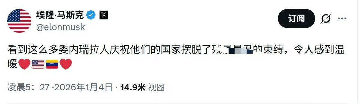马斯克对特朗普抓捕马杜罗的行动表示支持!觉得这是委内瑞拉人民的胜利!委美冲突外交部回应美对委军事打击 委内瑞拉副总统代行总统职权