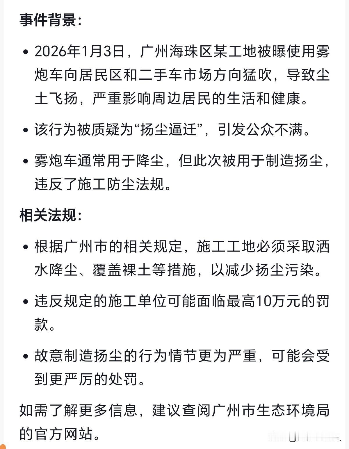 2026年广州这个雾炮车扬尘报道,我啥有点不信呢?广东一直都给其他省份的人留的印象是包容、适合经商地方、敢为天下先等褒义标签。 拿雾车故意扬尘,人为制作“沙尘暴”来逼不愿拆迁的这种严重违法,不敢相信是广州这座城市能做出来的,总觉得应该是有所误会吧[what]
