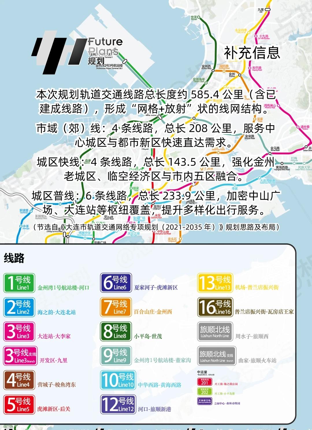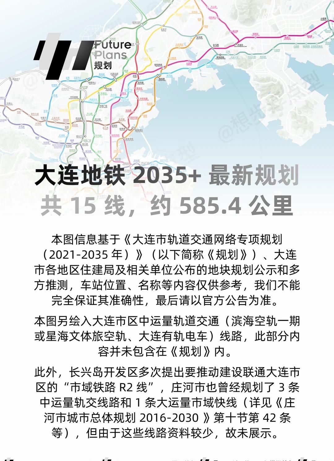 规划|大连地铁 2035+ 最新规划图出炉 📖 本图信息基于《大连市轨道交通网络专项规划(2021-2035年)》(以下简称《规划》)、大连市各地区住建局及相关单位公布的地块规划公示和多方推测,车站位置、名称等内容仅供参考,我们不能完全保证其准确性,最后请以官方公告为准。 🖌️ 本图另绘入大连市区中运量轨道交通(滨海空轨一期或星海文体旅空轨、大连有轨电车)线路,此部分内容并未包含在《规划》内。 ❌ 此外,长兴岛开发区多次提出要推动建设联通大连市区的“市域铁路 R2 线”,庄河市也曾经规划了 3 条中运量轨交线路和 1 条大运量市域快线(详见《庄河市城市总体规划2016-2030》第十节第 42 条等),但由于这些线路资料较少,故未展示。 👇🏻 更多信息和源文件见附着文件。感谢作者@想步浮点型 对本站的大力支持,本图未经允许禁止商用。 轨道交通 规划