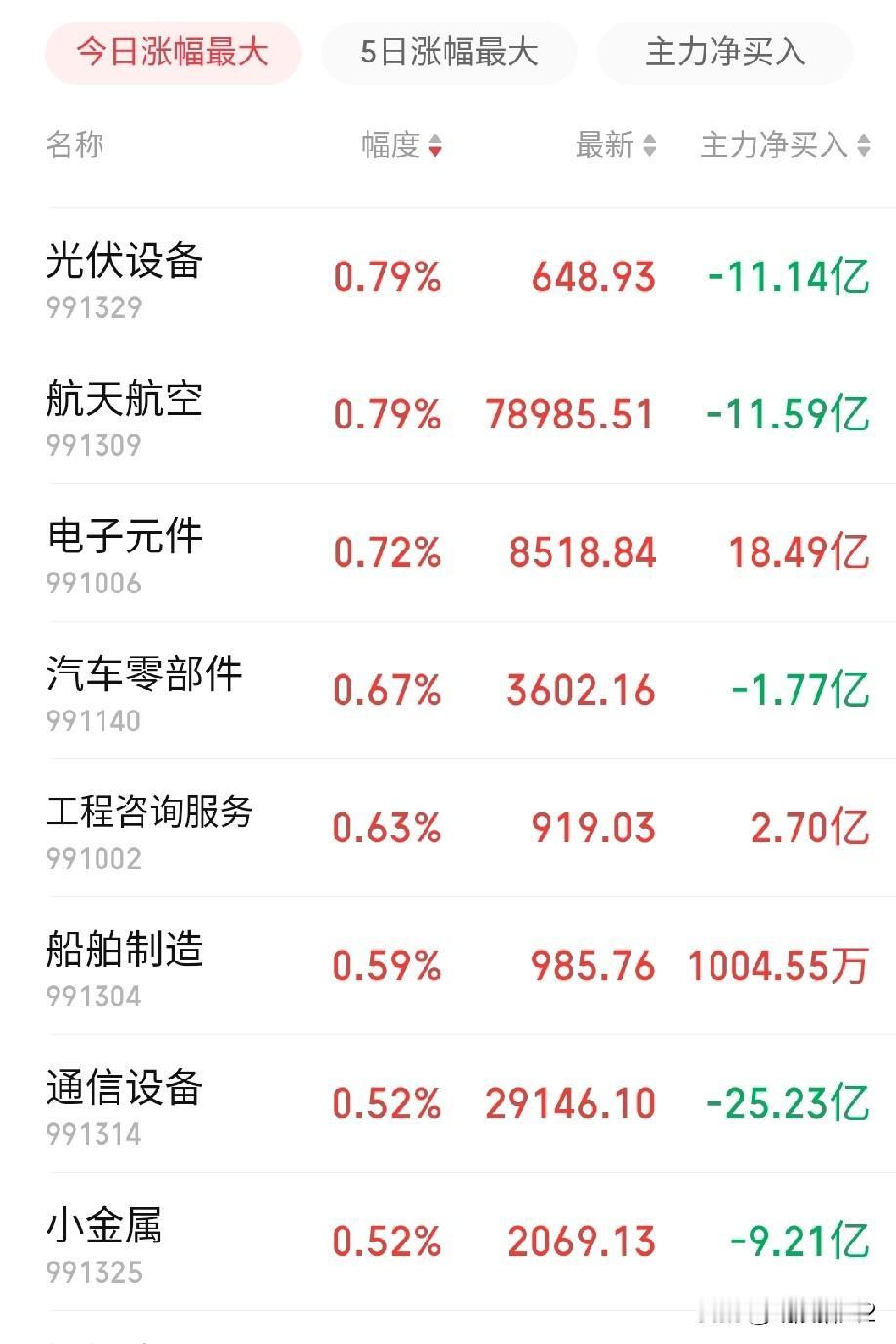 12月29日午评。两午上午最大的特点是什么?各位散户朋友要注意什么? 直接点明要害:两市上午继续放量,但是指数却是滞涨的,出现了明显的放量滞涨信号(图1)。一旦出现这种信号,后市令人堪忧。毗陵猎人始终认为,这里必须要进行一个短周期调整,否则大家买入意愿是不强烈的。 比如说今天的商业航天,再次走出强势行情,我就问大家,这个位置敢不敢追高?如果不敢,那大家的想法和你一样,这就是买入意愿不强烈。 贵金属和有色今天也是继续强势,但是它们的上涨逻辑和商业航天有所不同,如果前期有底仓,可以持股观望。商业航天就要斟酌行事了。事实上,今天上午商业航天、光伏和通信设备等板块的资金都是呈大幅流出的(图2),这正是前几天的热门板块,大家小心为妙,可趁股价高位震荡时适当做一下减法。 预计下午,沪指可能冲高回落后收出小阴线,结束8连阳。即使今天不收阴,明后面天也必收阴线。 个人观点,不构成投资依据,不喜勿喷。祝大家下午好运。