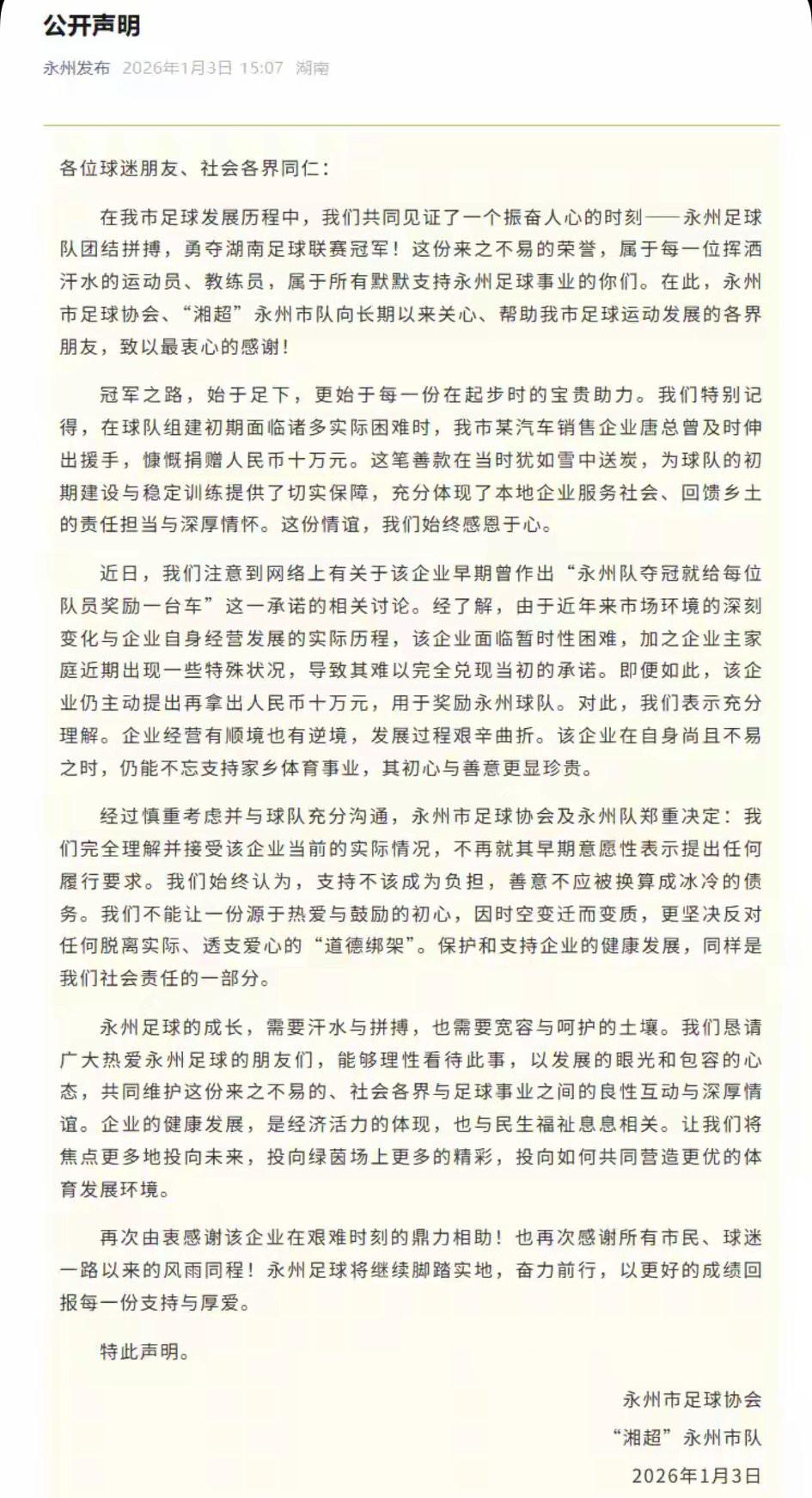 一份声明,双方释怀!永州足球未来可期! 去年8月份,永州足球队的赞助商,某集团唐女士为激励球队,面对镜头,公开承诺若夺冠则“给每名队员奖励一台车”。 然而,当永州在湘超夺冠之后,唐女士并未履约,而且清空了个人媒体账号。 此举引发网友们的热议。 好在球队表态,对赞助商表示了感谢。 1月3日,永州市足球协会与永州队联合发布《公开声明》。 这份声明非常及时,可以说,化解了唐女士面临的尴尬局面。 声明中,让大家了解到唐女士的企业遇到了困难,并不是她故意食言。 而球队将不会再对其“早期意向性承诺”提出任何履行要求。 这样就避免了舆论升级,保留了双方的体面。