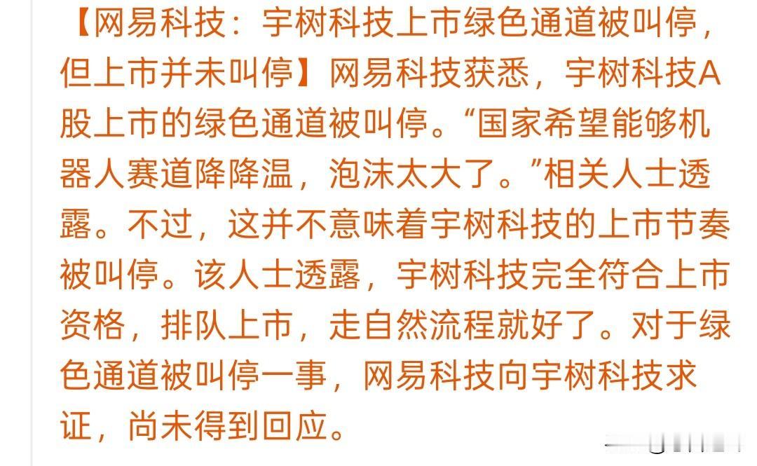 宇树科技绿色通道被叫停,这是要给科技股疯炒降温了 上午刚判断下周要回避科技股,下午就传出宇树科技上市绿色通道被叫停了。 这也是预料之中的,绿色通道被叫停,不是上市被叫停,换句话说,就是掌握科技股的炒作节奏,市场再也禁不起这般折腾了。 前有摩尔线程,再有木曦股份,后面接着长鑫科技,还有个商业航天,要是再来个宇树科技,市场能够接受的了吗? 今年以来,科技概念太过狂野,两个机器人借壳,把股价炒上天了,最近的航空航天也是无脑炒作…… 与之对应的就是,很多红利股,股价不断创新低,如果再不遏制这种炒作,市场一旦风吹草动,这波行情就薨了。 岁末年初,为了大家过个好年,高低切换的风格是该到来了。
