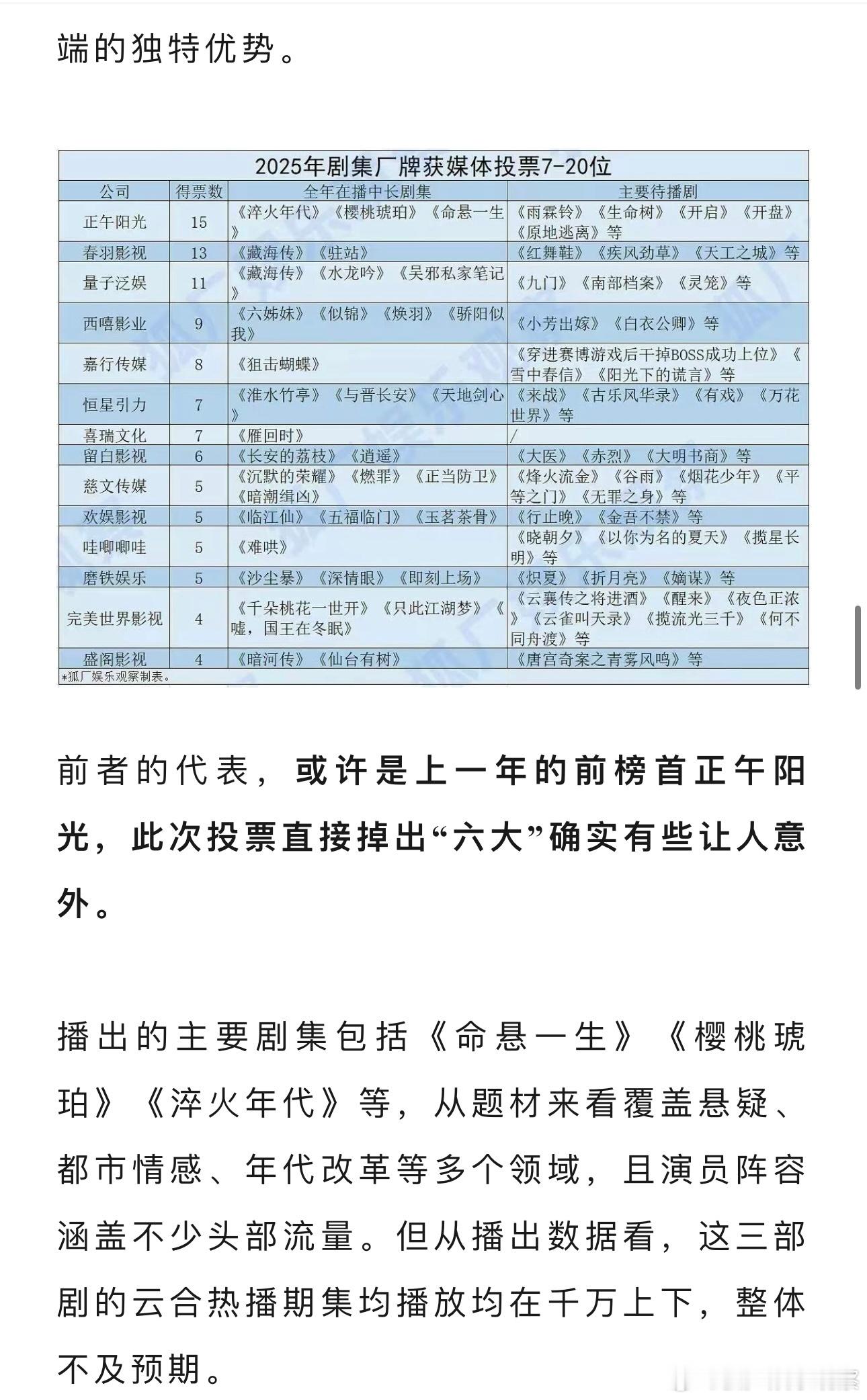 传统大厂ip转化难成口碑;新兴厂牌爆款形成能力有待观望;原有亮眼新兴厂牌整个失意而归…以上就是整个2025长剧市场的概况,媒体票选烧热灶的几家新贵里也都是在下半年里有黑马亮眼表现的,最典型的就是成绩漂亮的许我耀眼。(有热剧爆剧傍身的才是新贵,热剧爆剧来源是?这事儿可细品)迷信传统大厂+个人ip制作能力的绝对不是好倾向,看票选所有人也都挺拎得清的,毕竟僵化处理ip内容和太具有个人审美特色的作品如果内容差强人意,观众并不买单…(比如小裴和王一许今年这几部ip改编的结果…)高质内容、尊重IP改编和观众才是所有厂牌生存的原则和王道。