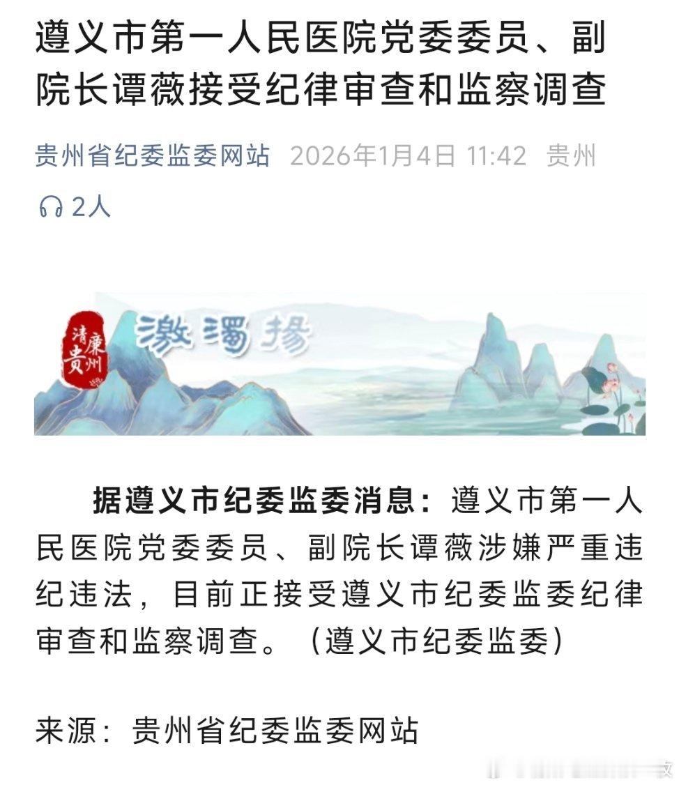 遵义市第一人民医院党委委员、副院长谭薇接受纪律审查和监察调查。
