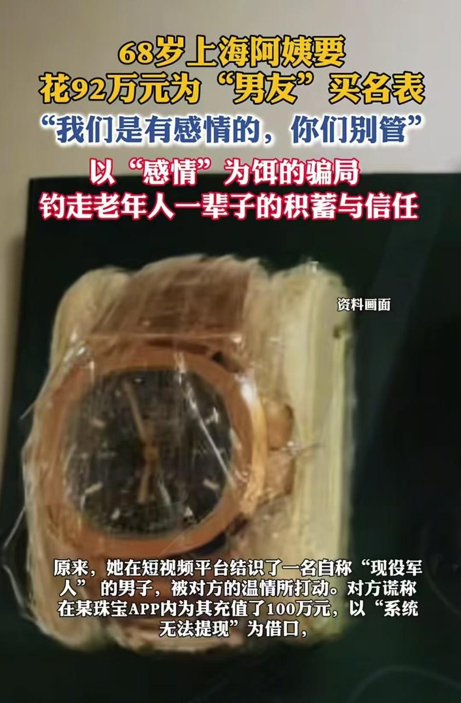 历尽人世沧桑,年近70的沪上阿姨还在相信爱情。可惜她没有遇到“白马王子”,而是江湖骗子。 要不是店员及时发现不对劲,要不是俩民J苦口婆心给她讲事实摆道理,也就一头扎进美丽“大饼”里,养老金被骗光光了。 元旦沪上阿姨给男友花92万买表,男友告诉他这样可以激活百万账户,回头给她8万差价。 人老心不老,看见鱼钩就要咬。 天底下哪得人又得钱的好事,差不多都是“双失”的结局。 万幸是钱保住了啊!