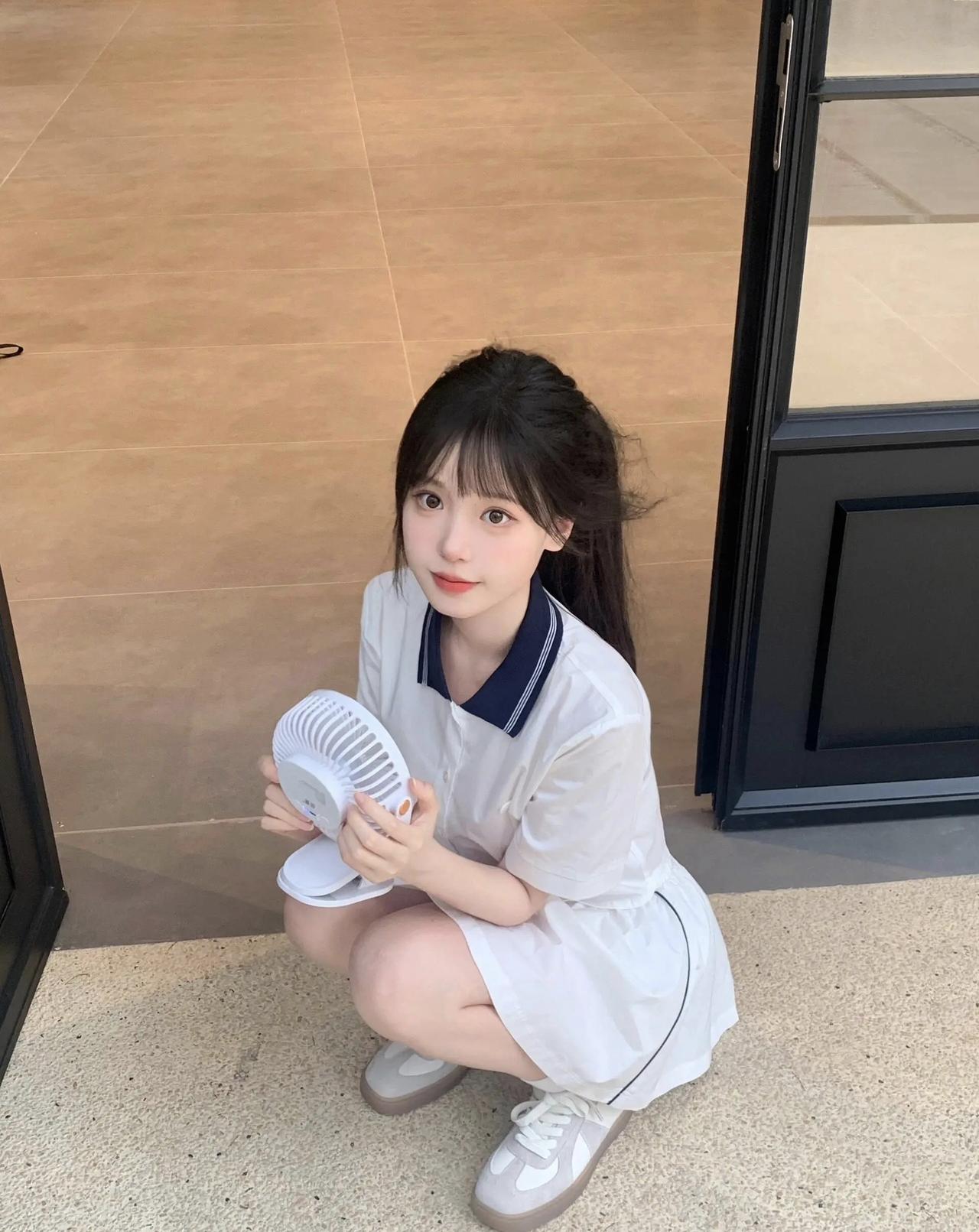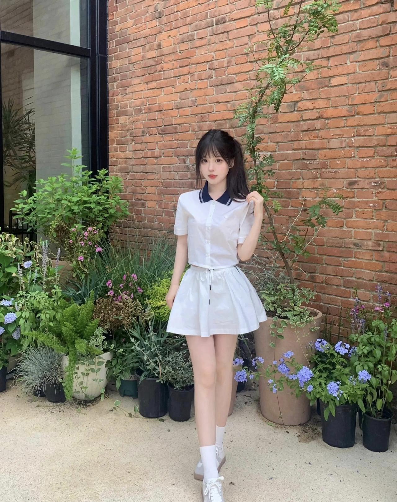 红砖与黑框门撞出的夏日甜妹瞬间,白裙配碎发,把青春的元气焊在身上~