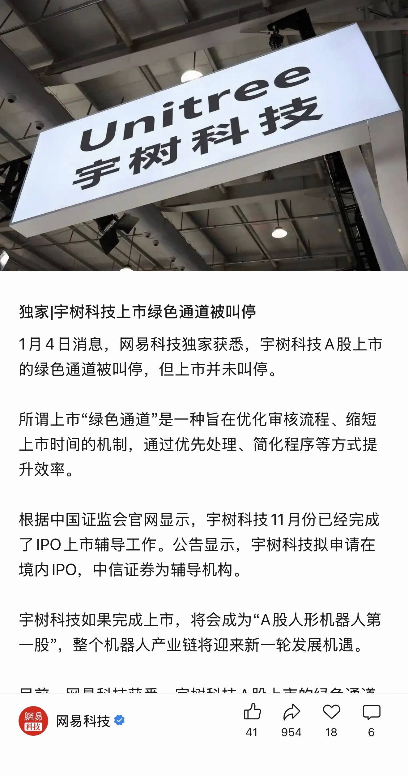 宇树科技A股上市的绿色通道被叫停了,接下来估计是排队上市,走自然流程了,时间会拉