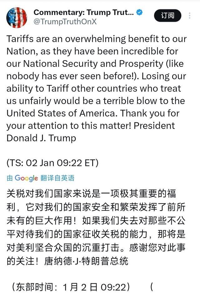 特朗普北京时间1月2日晚写道:“关税对我们国家来说是一项极其重要的福利,它对我们的国家安全和繁荣发挥了前所未有的巨大作用!如果我们失去对那些不公平对待我们的国家征收关税的能力,那将是对美利坚合众国的沉重打击。感谢您对此事的关注!” 特朗普第一任期内实施多项进口税调整,针对特定材料和国家。2018年春天,对钢材和铝材收取额外费用,税率分别为25%和10%,涉及多个贸易伙伴。加拿大作为铝主要来源,美国制造业成本因此上涨。欧盟采取反制,对美国某些出口品加税,美国农业部门出口受阻。政府发放补贴缓解农户压力。同年夏天,对部分中国货物征收高税,涵盖工业品,目的是处理贸易纠纷。美国企业供应链调整,部分转向其他亚洲国家。 2019年,税率进一步上调,覆盖更多消费品。美国零售行业面临库存问题,价格传导到终端。谈判中,与北美邻国更新贸易协议,新版要求更高本地部件比例,促进区域就业。欧盟达成临时安排,避免更大范围冲突。2020年初,与中国签订初步协议,暂停部分税上调,但维持多数征收。中国增加购买美国农产品作为交换。 第二任期启动后,2025年春天宣布普遍进口税,最低10%,针对广泛商品。纺织和电子行业订单转向本土。年底,对木材类产品调整税率,建筑成本随之增加。2026年初,数据显示制造业岗位有所增长,企业投资设备应对变化。全球供应链重组,美国某些工厂扩产,但整体物价指数上扬,消费者开支趋缓。这些政策旨在保护本土产业,却也引发国际摩擦。 根据最新追踪,2026年关税政策覆盖更多产品,包括家具和家居用品。政府延迟某些税率上调,如厨房柜子维持原有水平。农业领域,移除部分关税,如牛肉和橙汁,以稳定食品价格。平均税负预计每户增加一千多美元。智库分析显示,这些措施可能刺激制造业复兴,但也加剧贸易不平衡。企业反馈显示,部分公司受益于减少进口竞争,而零售商报告成本转嫁压力。