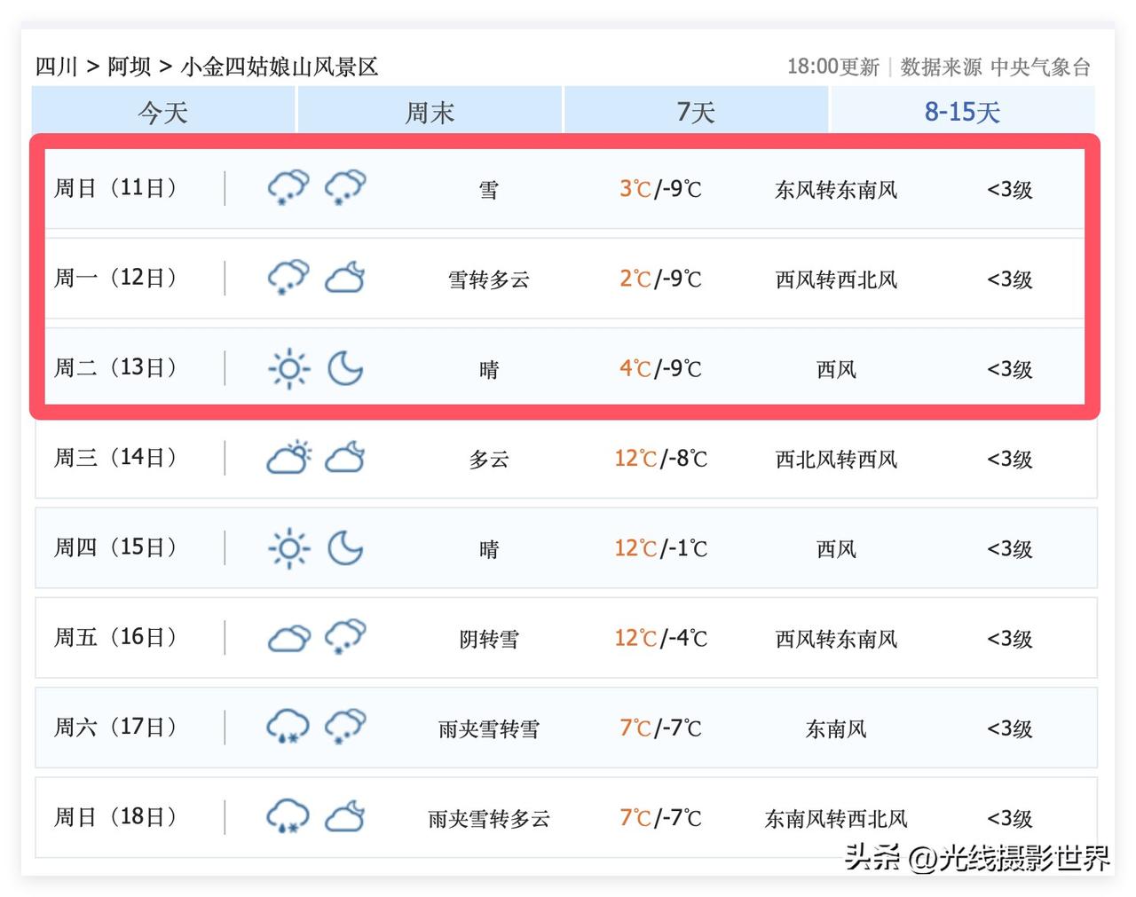 喜讯!1月11日,星期天,成都川A大军最爱的四姑娘山,下雪……1月12日,星期一,四姑娘山,雪转多云……所以,摄影畅销书作家曾兰老师,已经开始计划四姑娘山的雪景啦!太棒了! 就是要雪后初晴,蓝天白云,晴空万里……白雪皑皑……雪松,雾凇……冰雪世界……多么美丽啊! 四姑娘山的雪山,光线摄影学院曾兰老师,已经蠢蠢欲动啦!