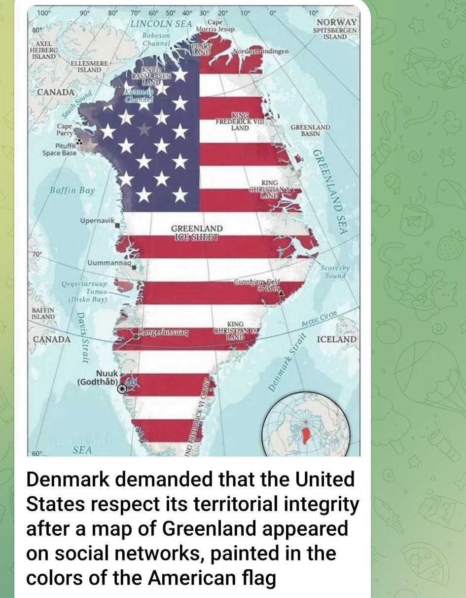 丹麦要求美国尊重其领土完整 🇩🇰🇺🇸 在社交媒体上出现了一张涂有美国国旗颜色的格陵兰岛地图(map)后,丹麦要求美国尊重其领土完整(integrity)。 这张图片(image)由白宫副幕僚长斯蒂芬·米勒(Stephen Miller)的妻子发布,并配文“即将到来”。对此,丹麦外交官索伦森(Sørensen)回应称,美国和丹麦是北约盟友(allies),华盛顿应尊重该王国的领土完整。