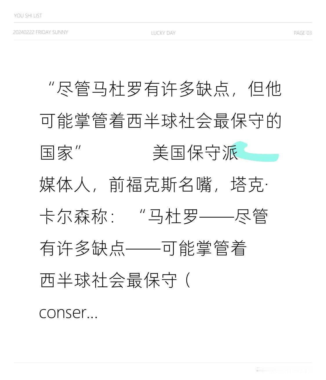 “尽管马杜罗有许多缺点,但他可能掌管着西半球社会最保守的国家” 🎙️🇻🇪 美国保守派媒体人,前福克斯名嘴,塔克·卡尔森称: “马杜罗——尽管有许多缺点——可能掌管着西半球社会最保守(conservative)的国家。 委内瑞拉已经禁止(banned)色情作品,禁止堕胎(abortion),禁止同性婚姻,禁止性别重置手术,并禁止高利贷。 在委内瑞拉,没有利率高达 40% 的信用卡(credit cards)。 “谁在乎?”我在乎。我有孩子(children)。”