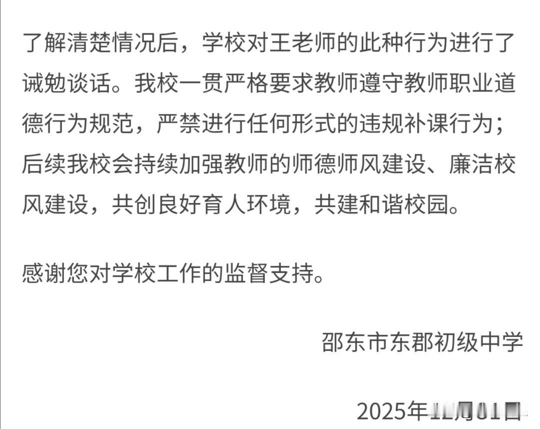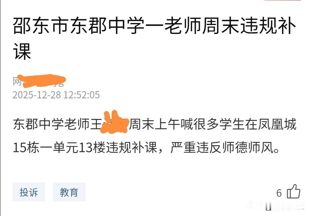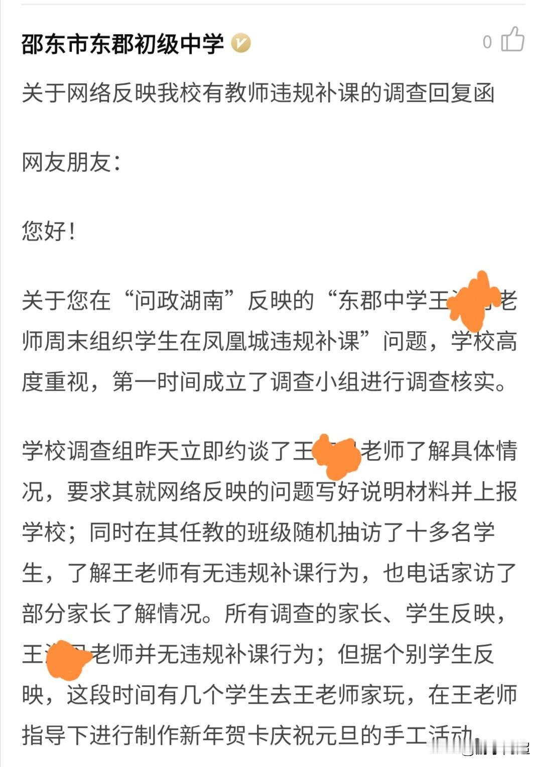 近日,有人于湖南问政平台反映邵东市东郡中学某老师违规补课,官方对此作出了回复。 网友指名道姓地指出,东郡中学某老师在该校隔壁的凤凰城小区召集学生违规补课,甚至连补课地点所在的楼栋和单元都明确指出。 学校了解情况后,约谈了该老师,并要求其针对网友反映的补课情况撰写一份说明材料。 尽管东郡学校回应此事的理由略显牵强,但如此处理想必也起到了一定的震慑作用。 相较于其它学校在面对外界反映本校老师违规补课问题时,常以“查无此人”或“查无此事”回应公众,东郡学校并未回避问题。