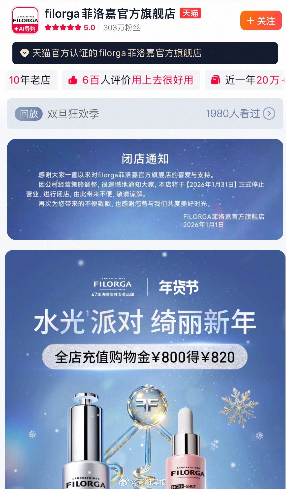 【#菲洛嘉关闭天猫旗舰店#,#菲洛嘉回应关闭天猫旗舰店#】近日,FILORGA菲洛嘉天猫官方旗舰店发布闭店通知:感谢大家一直以来对filorga菲洛嘉官方旗舰店的喜爱与支持。因公司经营策略调整,很遗憾地通知大家,本店将于【2026年1月31日】正式停止营业,进行闭店,由此带来不便,敬请谅解。再次为您带来的不便致歉,也感谢您曾与我们共度美好时光。