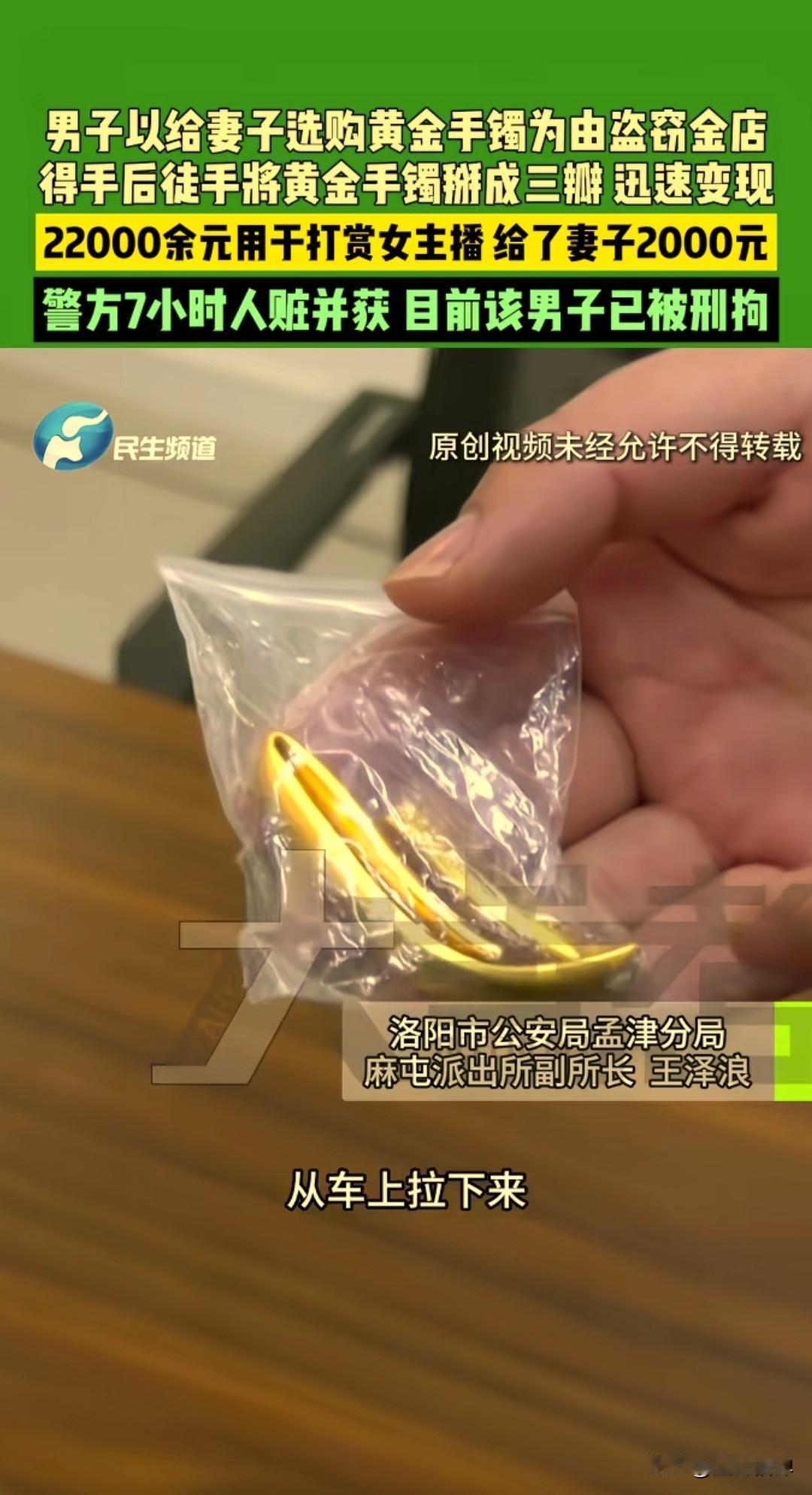 1月4日,在河南洛阳,一名戴着口罩戴着手套的男子到了一家金店,给店员说他要给自己的妻子买个黄金手镯,要看看挑一个,店员一听来生意了,拿出了不出同款的四个手镯放柜台上让男子挑选。 结果男子趁店员不备拿上手镯就跑了,店员一看慌了,马上报了警,接到报警后,洛阳公安局孟津分局麻屯派出所民警迅速展开调查。 男子得手后变卖了黄金准备逃往外地,已经买了去外地的高铁车票9点41发车,民警在9点40分的时候上车把这名嫌疑人从车上带了下来。 经过审讯得知,男子怕被追查到,就把几个手镯全部掰开,找了几个地方分开卖了,一共卖了29000元,其中的22000多元打赏给了女主播,给自己的妻子转了2000块钱,给自己买了一部1500块钱的手机。 来源:河南广播电视台民生频道《大参考》