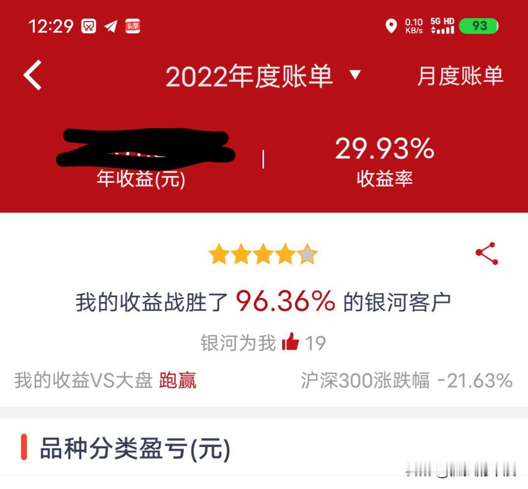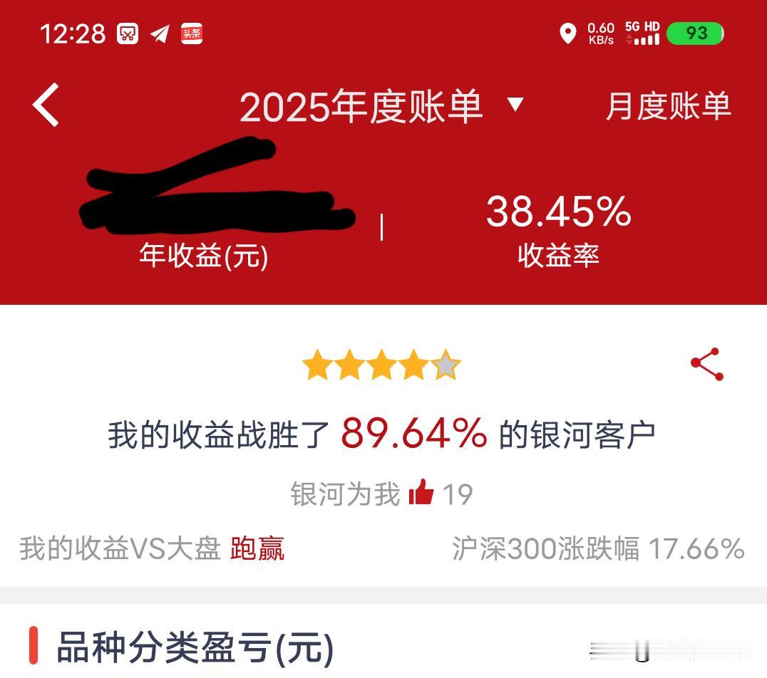 炒股五年,点赞的全是陌生人,38.45%年收益跑赢大盘的背后 打开2025年证券年度账单,38.45%的收益率让我愣了愣,底下的点赞数停在19,翻了翻记录,五年里这些点赞竟全是陌生的银河客户。 2021年我拿下29.20%收益,彼时沪深300跌了5.20%;2022年市场大跌21.63%,我依旧攥着29.93%的收益;2023年指数再跌11.38%,9.71%的收益虽降却仍跑赢;2024年指数回升14.68%,我的23.67%收益稳稳跟上;到2025年,指数涨17.66%,我直接冲到38.45%。 五年里,收益从没输给大盘,战胜的客户比例也始终超80%。只是身边人很少过问我的操作,倒是陌生网友的点赞,成了这五年投资路上最实在的回响。 年份 收益率 战胜客户比例 沪深300涨跌幅 2021 29.20% 83.05% -5.20% 2022 29.93% 96.36% -21.63% 2023 9.71% 81.31% -11.38% 2024 23.67% 86.64% 14.68% 2025 38.45% 89.64% 17.66% 炒股收益 A股半年收益 上证收益指数 上证收益指数 中国证券指数 股市年终盘点 年报炒股 炒股收益图 股票收益曲线 证券公司指数