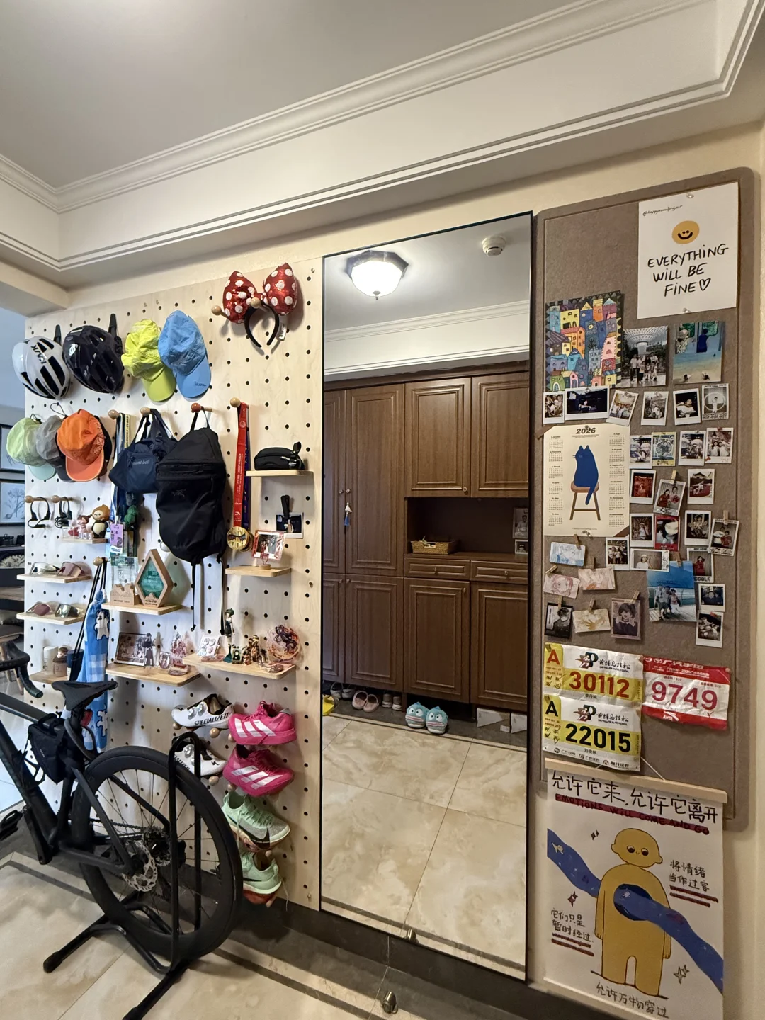 年底终于送自己一面快乐墙 入户原来是一面大镜子已经看腻了那就改造吧~ 网上定制了一面洞洞板和镜子(同一家) 👉🏻下单到上墙大概一周左右 👉🏻洞洞墙装好后接着测尺寸定制毛毡板 ❤️成品装好后把家人的照片贴毛毡板上,马上幸福感拉满~ ✅洞洞板优点是可以随时调整阵列的位置 看腻了可以更攻位置,我之前打算把公路车挂上墙,后来发现入户位置够所以放地下,大家也可以买配件上墙 洞洞板可🍑价格都差不多 我的板材质是多层实木板 - 露营/徒步/骑行/跑步 一代人有一代人的不动产