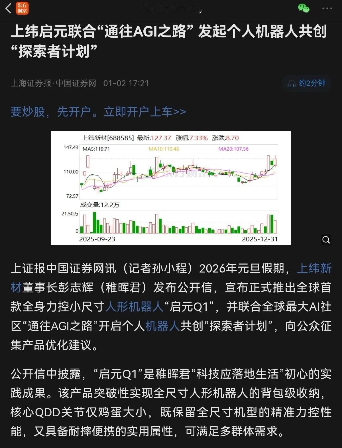 利好!大利好来了!上纬新材突发大利好不出意外的话,明日上纬新材要跳空高走了,人形机器人又要起飞了…就在刚刚!财联社最新消息:上纬新材董事长稚晖君元旦发布公开信,正式推出全球首款全身力控小尺寸人形机器人“启元Q1”,并联合全球最大AI社区“通往AGI之路”开启个人机器人共创“探索者计划”,此利好消息一出,持有机器人概念的股民们乐开花了,这对于人形机器人产业又是一个重大利好事件,启元Q1的技术定位是全球首款全身力控小尺寸人形机器人,精准瞄准“个人机器人” 赛道,这为人形机器人商业化提供了一种全新的思路,一旦被市场认可,上纬新材又将会在个人机器人赛道占得先机,这不仅对上纬新材是利好,对于整个人形机器人产业都是大利好,而2026年又被广泛视为人形机器人量产元年,市场预期全球出货量将显著提升,不出意外的话,人形机器人产业将会有大量资本涌入,商业化前景值得期待!股民们!坐稳扶好!受此利好消息刺激,预计明日上纬新材有望高开高走封板了,有望带动人形机器人板块大爆发了!