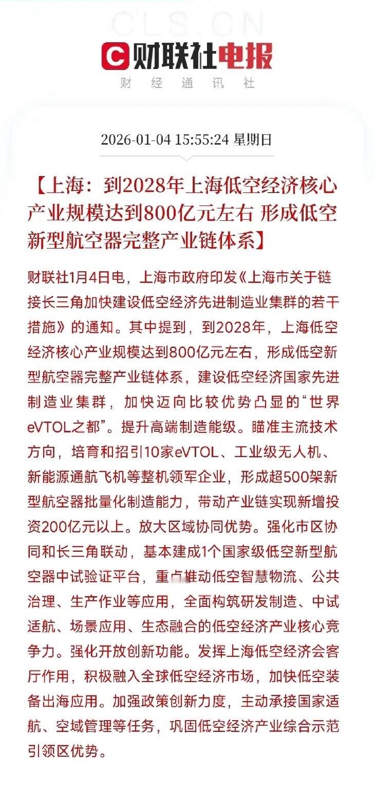好消息!上海低空经济发展规划,800亿蓝图出炉!这些行业受益刚刚,上海发布,低空经济赛道发展蓝图,到2028年,上海低空经济产业规模,要达到800亿元左右,重点发展,有优势的的方向, 世界eVTOL之都!这不仅是目标,也是一份详尽的产业路线图。1. 培育整机十大金刚:瞄准主流技术方向,培育和招引10家eVTOL(飞行汽车)和工业级无人机等,整机领军企业。目标是,形成年产超500架,新型航空器的批量化制造能力,以此带动产业链,实现新增投资200亿元以上。2. 打造国家級中试平台:上海将强化长三角协同,基本建成,1个国家级低空新型航空器中试验证平台。这个平台至关重要,它是连接实验室技术和商业化产品的桥梁,能加速产品的适航认证和迭代速度,解决行业主要痛点。3. 推动物流和公共治理应用:产业的生命力在于应用。将重点推动低空智慧物流、城市公共治理(如巡检、消防)、生产作业等商业化场景落地,让技术真正产生经济和社会价值。这份规划,为资本市场,绘制了一张低空经济藏宝图:上游:重要零部件和材料这是技术壁垒较高的环节,决定飞行器的性能和安全。包括:· 动力系统:高功率密度电机、电控。· 能源系统:高安全、高能量密度的动力电池。· 关键材料:碳纤维复合材料等,轻量化材料。· 重要子系统:飞控系统、导航通信、传感设备等。中游:整机制造和集成eVTOL作为集成所有技术的平台,其整机厂商,将成为产业链的枢纽和估值核心。下游:运营、服务和生态随着飞行器量产,下游将会有巨大需求:· 运营服务:低空物流公司、城市空中交通(UAM)运营商。· 基础设施:起降场(Vertiport)、充电/加氢站、空域管理系统的建设和运营。· 数据和服务:飞行数据服务、维护保障等。坐稳扶好! 这不仅是一个板块的机会,也是一场,关于未来城市交通形态的变革。从材料、零部件、整机到运营,一条全新的赛道,正在上海及长三角加速铺开。