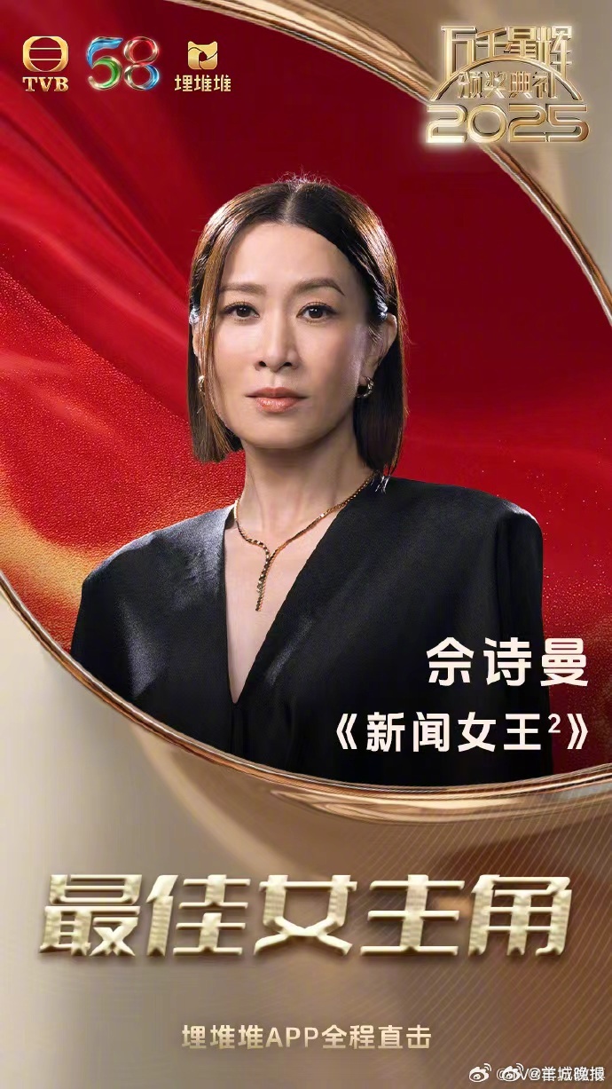 1月4日晚,TVB#万千星辉颁奖典礼2025#于澳门举行。佘诗曼凭借《新闻女王2》第四度夺得“最佳女主角”,成为史上首位四度获得该奖的艺人。她同时亦再次夺得大湾区最喜爱TVB女主角,成为全晚焦点。她现场表白角色Man姐文慧心:“上一次拿奖,我觉得是佘诗曼拿的,但这次,我觉得拿奖的是Man姐。我不只是饰演这个角色,而是成为这个角色。她带领着我,透过精彩的剧情,与观众再次产生共鸣。我想跟Man姐说一句,‘我喜欢你,文慧心!’”《新闻女王2》无疑是本届颁奖礼的大赢家,包揽最佳剧集、最佳男女主角、最佳男女配角、大湾区最喜爱TVB男女主角、大湾区最喜爱TVB剧集等9大奖项。以下是完整获奖名单:最佳剧集:《新闻女王2》最佳女主角:佘诗曼(《新闻女王2》)最佳男主角:黄宗泽(《新闻女王2》)最佳女配角:王敏奕(《新闻女王2》)最佳男配角:何广沛(新闻女王2》大湾区最喜爱TVB剧集:《新闻女王2》大湾区最喜爱TVB男主角:黄宗泽(《新闻女王2》)大湾区最喜爱TVB女主角:佘诗曼(《新闻女王2》)大湾区资讯节目:《女神配对计划》飞跃进步女艺人:叶蒨文飞跃进步男艺人:吴业坤最佳女新人:倪嘉雯最佳男新人:冯皓扬、刘洋最佳衣着男艺人:朱敏瀚最佳衣着女艺人:陈晓华最佳综艺节目:《中年好声音3》最佳信息及专题节目:《东张西望》最佳电视歌曲:《Seeds of Truth》-《新闻女王2》)詹天文最佳男主持:林盛斌最佳女主持:车婉婉专业精神奖:TVB字体设计师张济仁([原创]记者:胡广欣;编辑:惠天骄;审签:岑杰昌)