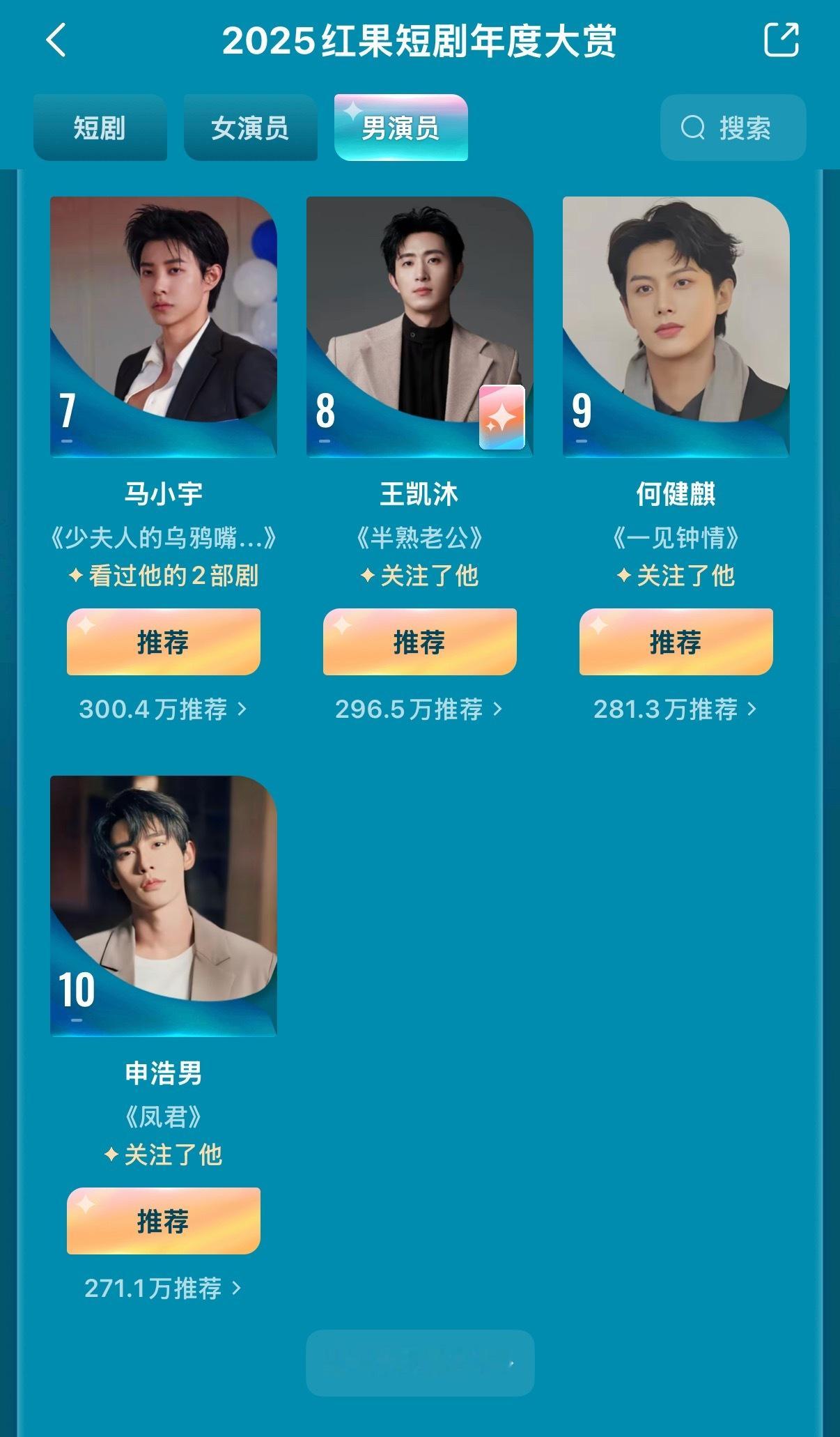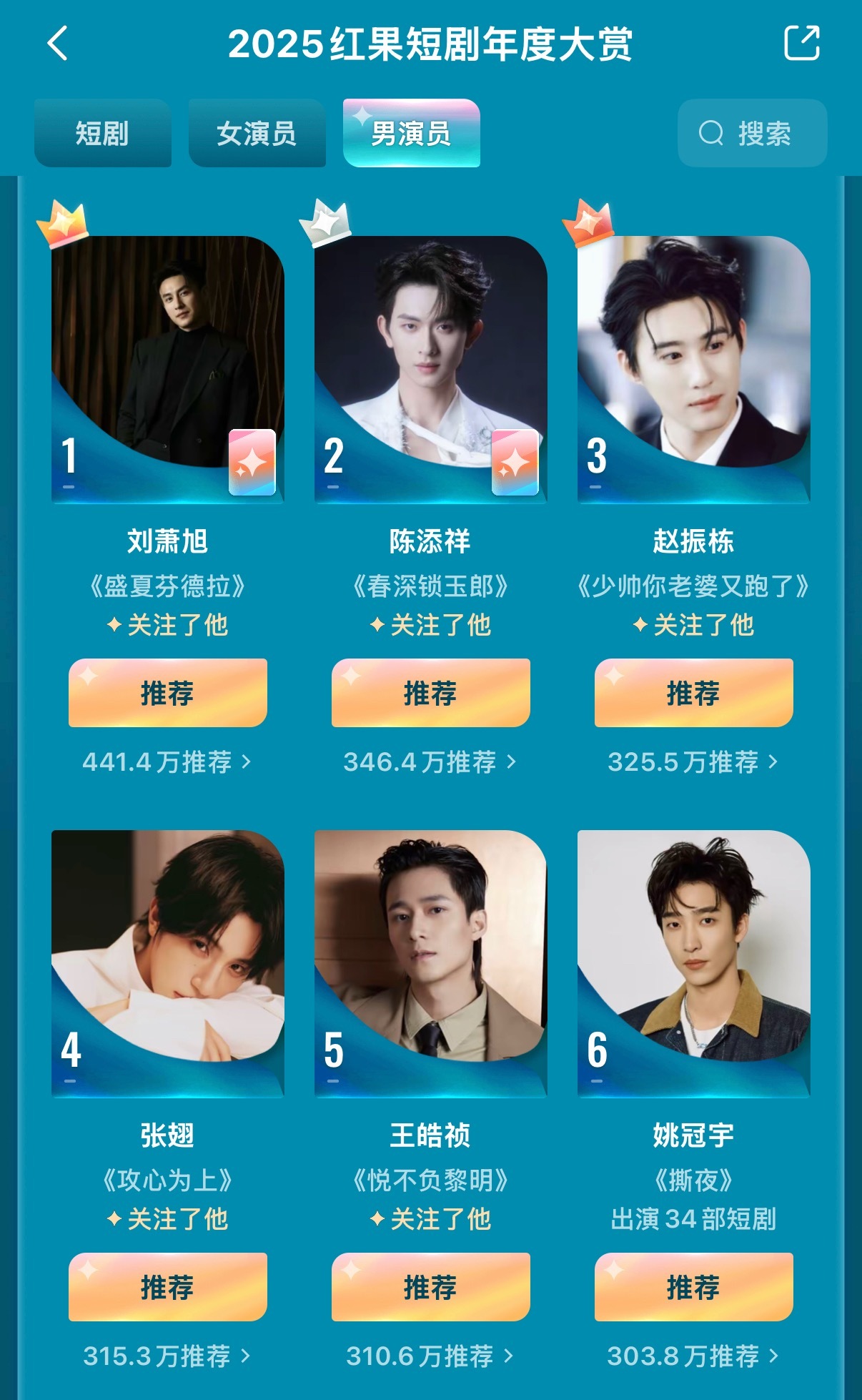 2025红果大赏男演员前十名:1️⃣刘萧旭2️⃣陈添祥3️⃣赵振栋4️⃣张翅5️⃣王皓祯6️⃣姚冠宇7️⃣马小宇8️⃣王凯沐9️⃣何健麒1️⃣0️⃣申浩男恭喜以上人员! 🫣短丝辛苦了,群友辛苦了!