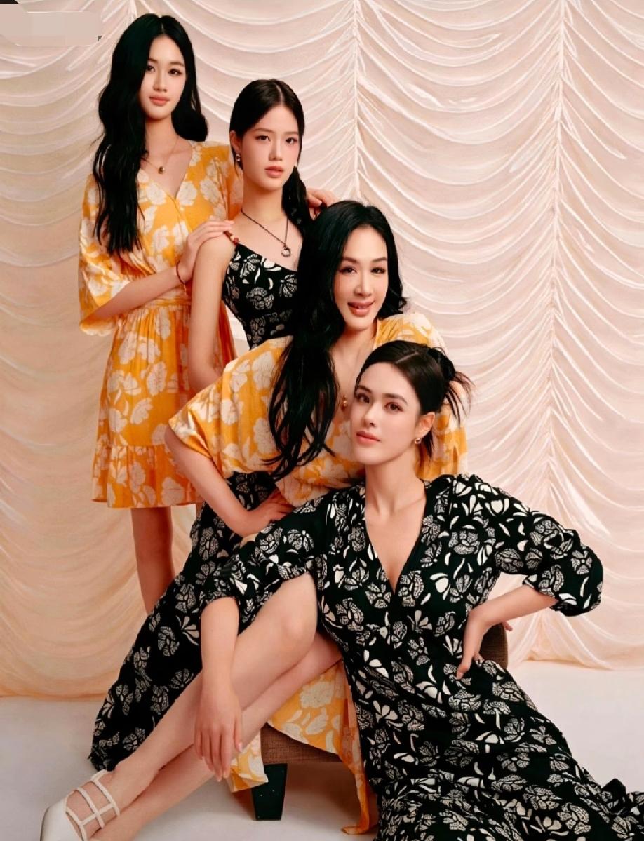 钟丽缇母女四人同框,颜值惊艳,穿搭默契满分💛 55岁的钟丽缇与三个女儿的同框照也太养眼了! 她们虽然穿着不同款式的裙子,但巧妙地选择了黑底白花和黄底白花的同款印花,既保留了个人风格,又在视觉上形成了和谐统一的“姐妹装”效果。母女四人颜值都超高,状态绝佳,尤其是钟丽缇,完全看不出年龄,和女儿们站在一起更像是姐妹,这大概就是最美的“遗传”吧! 钟丽缇 母女同框 高颜值