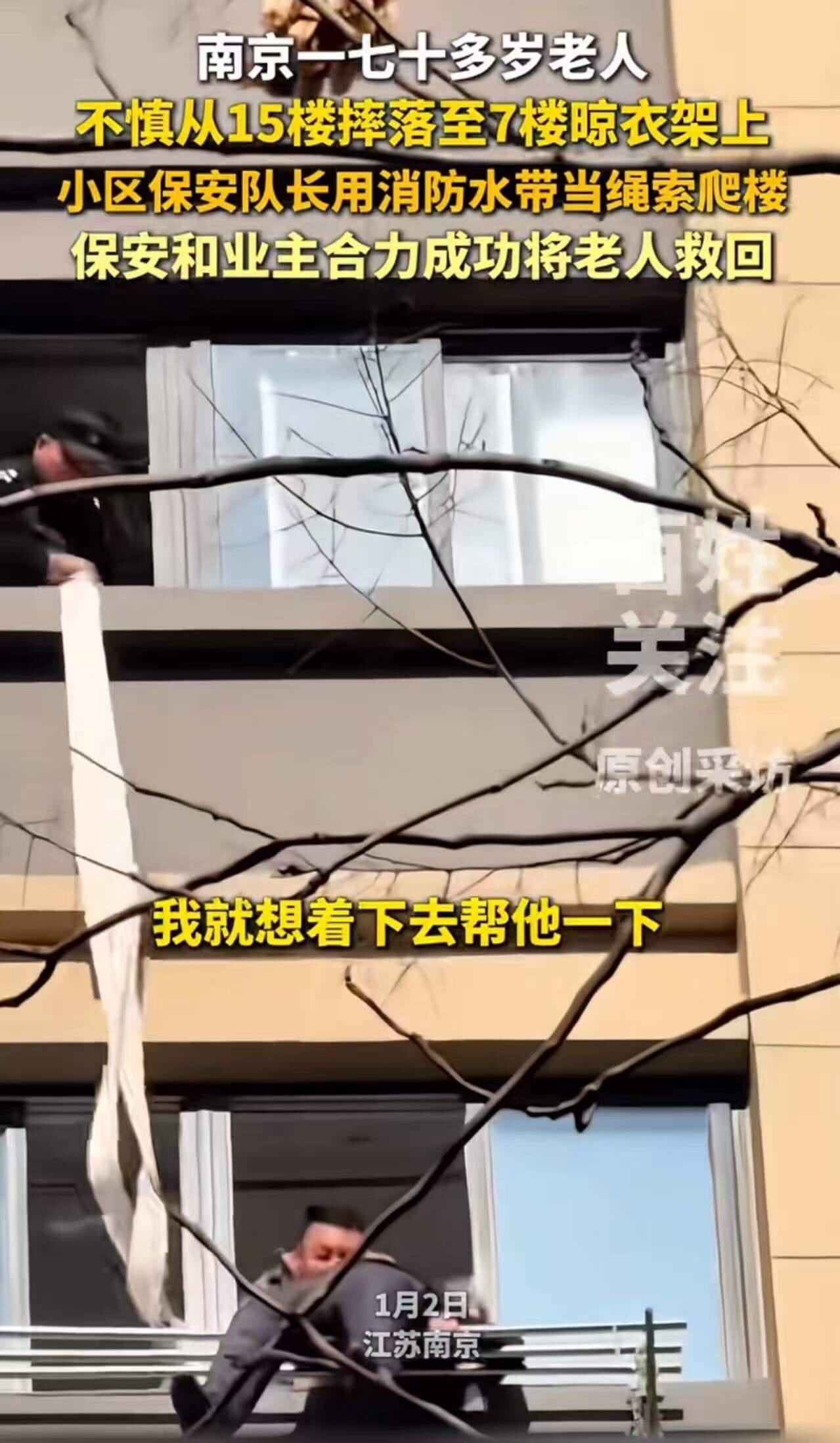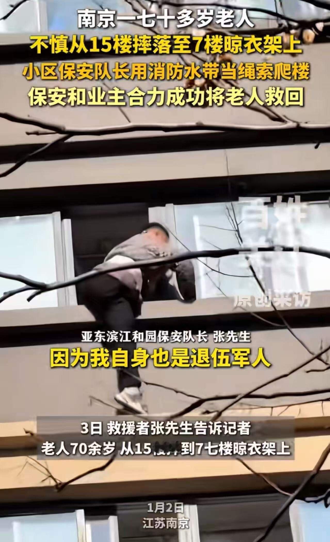 “一月才挣几千块,却干着拿命拼的活儿!”南京,一位七旬老人不慎从15楼坠落,卡在7楼的晾衣架上,命悬一线。千钧一发之际,小区保安队长挺身而出,以一根消防水带作“救命绳”,徒手攀爬展开救援。而他敢如此行动,是因其另有特殊身份! 这位看似平凡的保安队长,究竟藏着怎样惊人的秘密?在这普通岗位上,他用行动诠释了何为真正的英雄主义,也让我们重新审视身边那些默默守护之人。 事情发生在南京的一座老旧小区。那天,阳光正好,空气中满是熟悉的气息——那是生活的味道,也是平凡日子里最真切的模样。然而,就在这看似平静的一天,一场生死危机突然降临。70多岁的老人不慎从15楼坠落,悬于半空,处境危急。更揪心的是,他身体卡在7楼晾衣架上,动弹不得,命悬一线。 危急时刻,小区保安队长李明(化名)毫不犹豫。他清楚,时间就是生命。手中唯一的“救命绳”——那根消防水带,成了唯一的指望。没有专业救援设备,也没时间等救援队,他决定自己上。 他徒手攀爬,宛如一只英勇的猎鹰,朝着悬挂的老人奋力扑去。每一秒都似历经生死考验,但他明白不能放弃。就在这千钧一发之际,他成功用消防水带绑住老人,将其稳稳拉了上来。老人被救时,浑身是血、脸色惨白,但生命之火仍在闪烁。 这场救援,感动无数人,也引发社会热议。有人说这是“平凡中的伟大”;有人则反思:为何身边会有如此令人敬佩之人? 然而,故事背后藏着惊人秘密。李明,身为小区保安队长,还有一段鲜为人知的过往——他曾是一名退役特种兵。 没错,你没听错!他曾在边境线上接受最严苛训练,面对生死从不退缩。这段特殊经历,让他在关键时刻有了非凡的勇气与胆识。正是这“特殊身份”,让他在危机中奋不顾身,用生命守护生命。 这也让我们不禁思考:社会上有多少像李明这样的“隐藏英雄”?他们或许没有耀眼光环,没有丰厚收入,但用行动诠释了责任与担当的真谛。 更值得深思的是,社会对这些“平凡英雄”的关注是否足够?他们的付出是否得到应有的尊重与认可?每个普通岗位背后,或许都藏着不平凡的故事。 或许,我们都能从李明的故事中汲取力量。无论身份、职位如何,只要心中有责任,就能在关键时刻成为他人的“救命稻草”。 这场生死救援告诉我们:英雄不一定要身披铠甲,也不一定要有超能力。有时,只需一根普通消防水带、一颗勇敢的心,以及一份对生命的敬畏。 所以,下次在生活中遇到困难挑战时,你能否像李明一样挺身而出,用行动守护在乎之人? 这个社会需要更多像他这样的“隐藏英雄”,他们以平凡书写不凡,用行动点亮希望。让我们为这些无名英雄点赞,也希望每个人都能在岗位上,成为关键时刻愿意冲在前头的人。 因为,真正的英雄,或许就藏在我们身边的每个角落。 安全生产 警钟长鸣