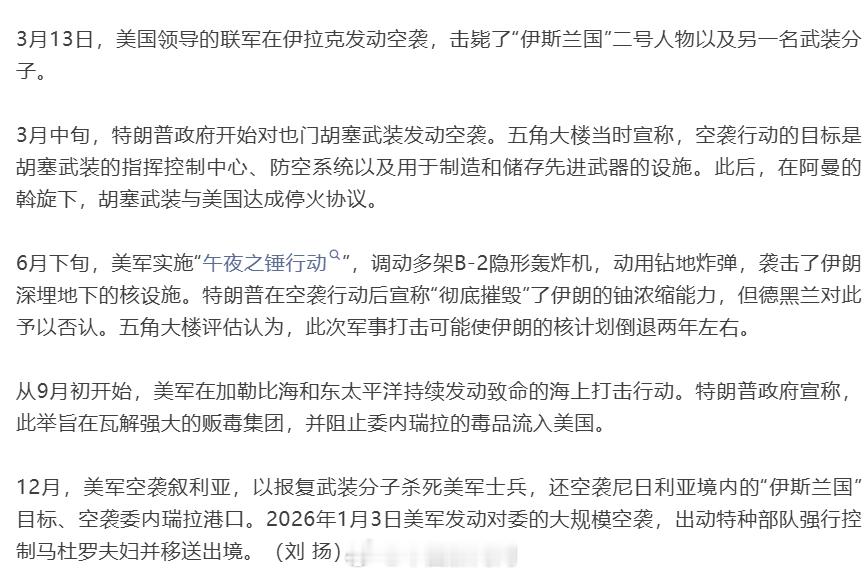 【特朗普1年发动空袭数超拜登4年总和:分别为626、555】美国《军事时报》网站1日刊发的一篇题为“一年来打击行动不断:特朗普执政期间美国军事行动激增”的文章称,自特朗普重返白宫以来,美国在海外的军事活动激增。报道称,自诩为“和平总统”的特朗普将武力扩张包装成“以实力求和平”的战略。根据武装冲突地点与事件数据项目(ACLED)汇编并提供给美国《军事时报》的数据,自2025年1月20日特朗普就职以来,美军至少实施了626次空袭行动。相比之下,美国前总统拜登在其4年任期内总共发动了555次空袭。(环球时报)丹麦首相要求美方停止威胁丹麦