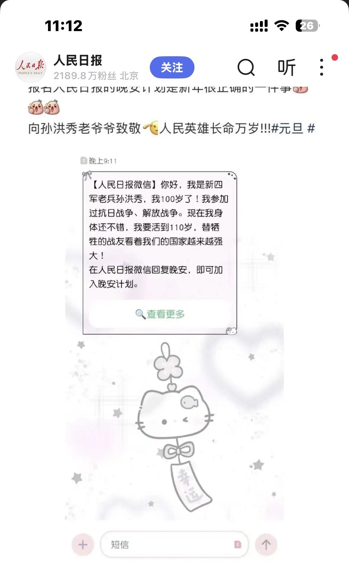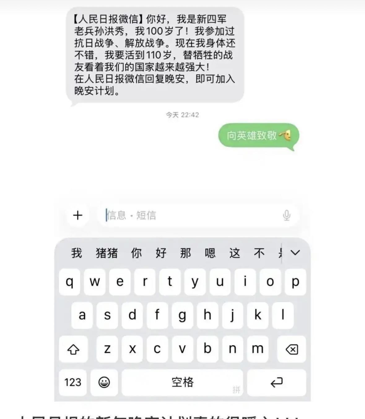你收到百岁抗战老兵孙洪秀的短信了吗? 1943年,他投身军旅,以伙计的身份潜伏搜集情报,忍辱负重间圆满完成任务。如今,百岁高龄的他仍坚持奔走宣讲抗战故事,生日之时许下心愿——要替牺牲的战友们,好好看看如今繁荣强大的祖国。