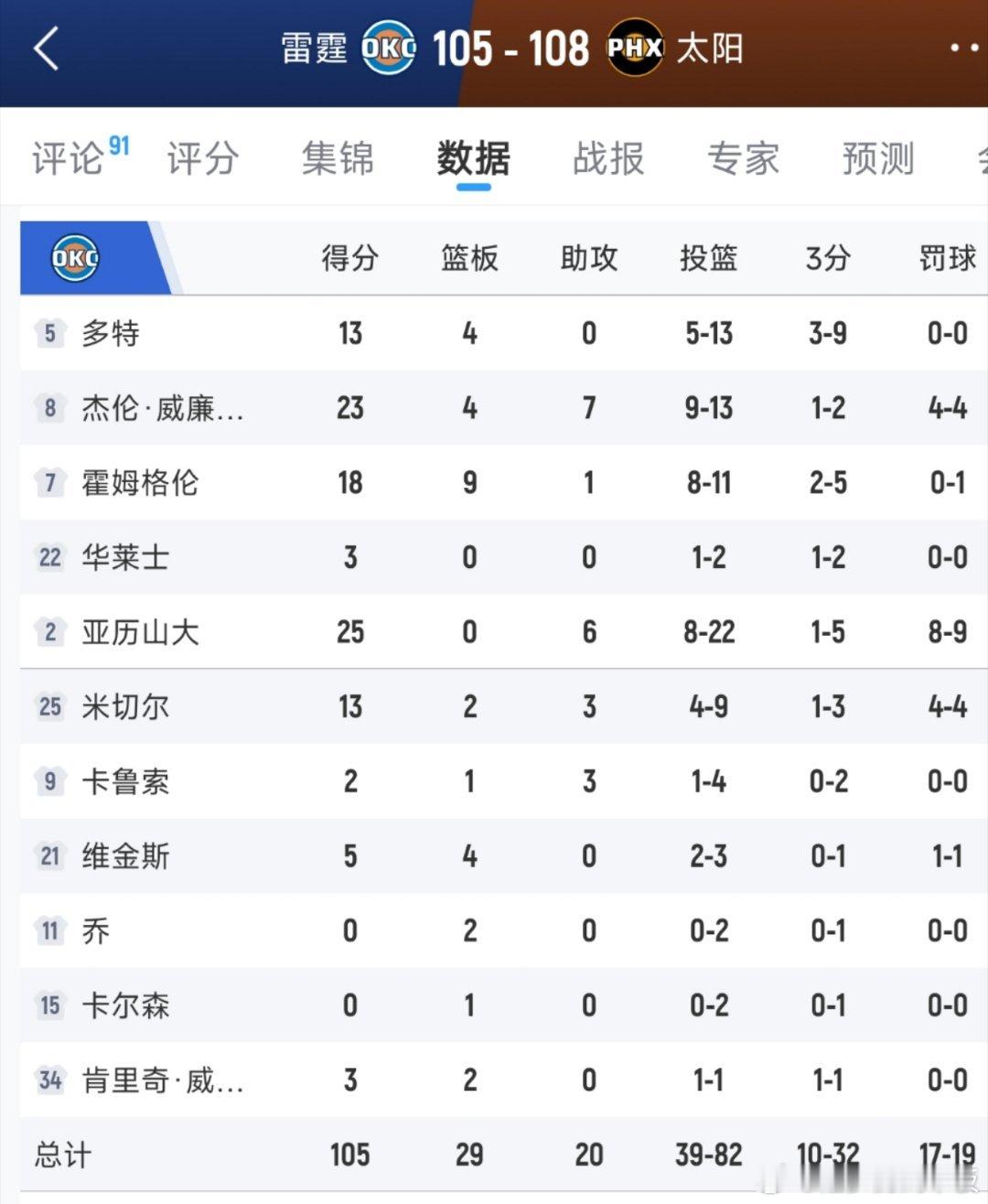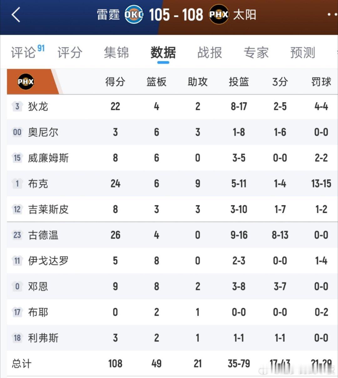 布克三分准绝杀!太阳主场108-105战胜雷霆,送给对手赛季第6败!太阳也结束了对阵雷霆的8连败,布克24分6板9助,狄龙22分,古德温26分;亚历山大25分,杰伦-威廉姆斯23分雷霆vs太阳布克三分绝杀雷霆