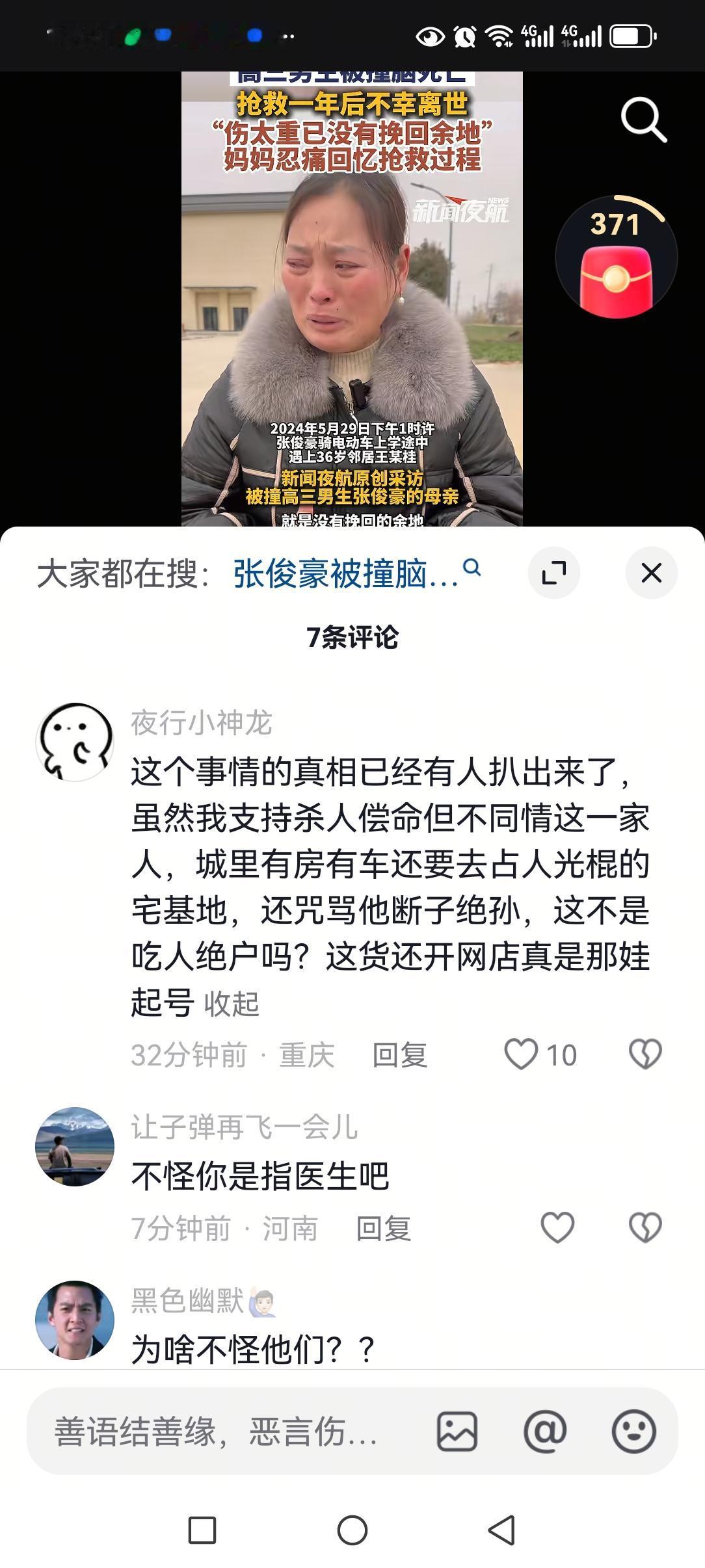 邻里之间还是要和睦相处,真闹出矛盾,只会两败俱伤! 刚刚刷到这个新闻,这位妈妈儿子被邻居开车故意撞死了。 她这个儿子现在已经上高三了,本来是今年准备考军校的,现在什么都没有了。 她这个邻居在庭上给她道歉了,她说不需要道歉,只要儿子。现在每天都在家里以泪洗面,度日如年,活的生不如死,道歉也解决不了任何问题! 看网民评论才知道,两家人的矛盾也是因为宅基地。 邻居无儿无女,是个光棍汉,才会走极端的。 看来没有家庭的人,性格都比较偏激,遇事不要于他们计较才能自保呀!