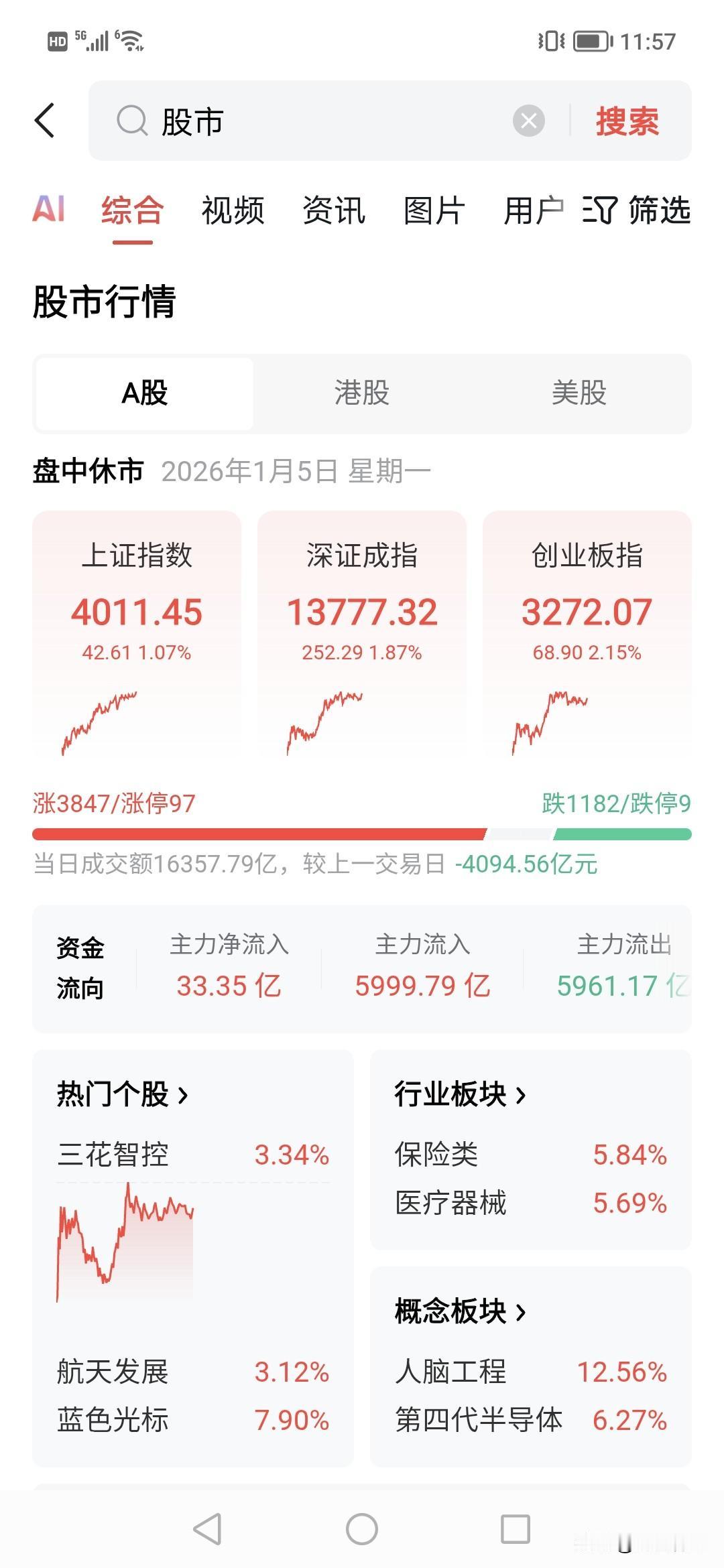 保险暴涨5%!!1.6万亿一个上午冲入2026年第一天股市。!!牛市开头。 酒店机场下跌,大多板块回升。! 保险,半导体,涨幅多,有色也在上涨。!!2026年上午开了好头,就是不知道下午,或者接下来,主力没有明显的买入。!!保险行业价值 保险