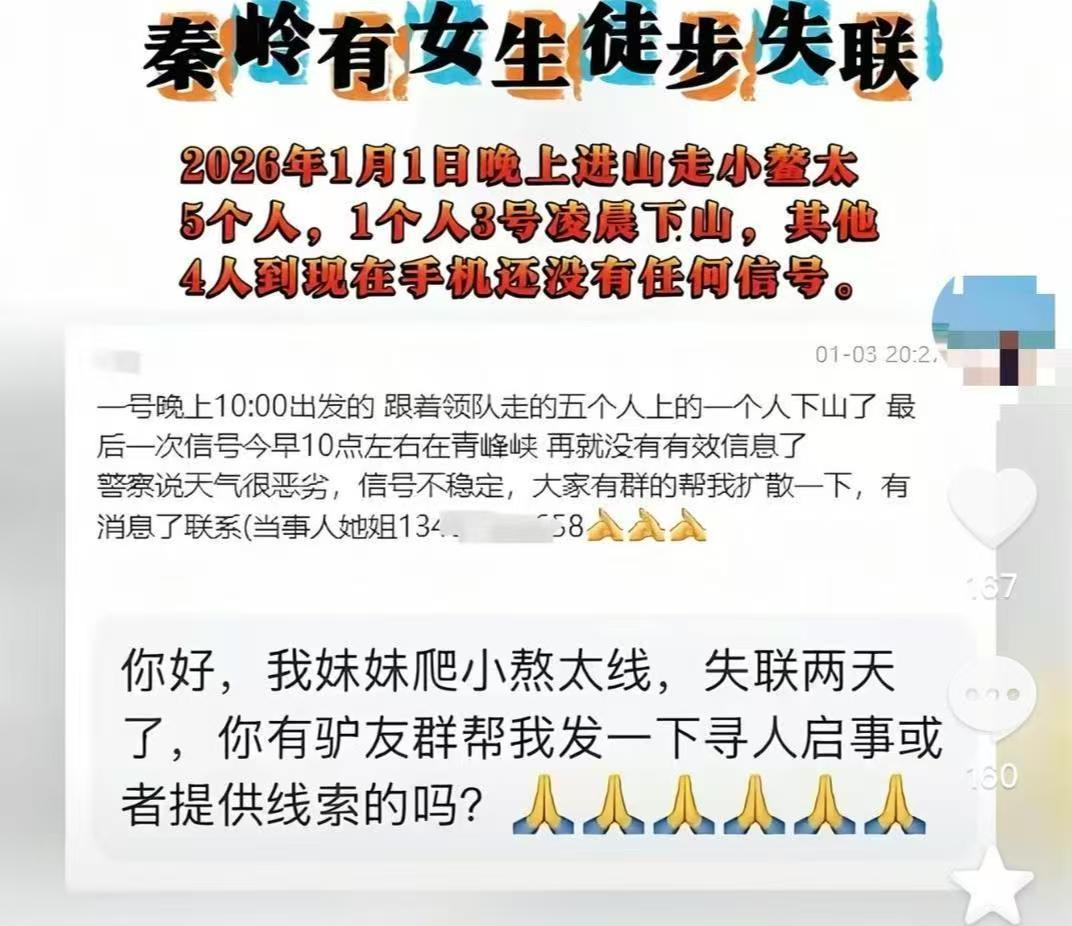2026年1月4日,当大多数人还在享受新年的余韵时,陕西太白山深处的一场搜救行动牵动着不少人的心。就在几天前的1月1日晚上,一名年轻女子跟着领队一行共5人,毅然踏上了进山之路,他们的目的地是传说中的“小鳌太线”。原本应该是一场充满野趣的徒步,转眼间却演变成了一场失联危机。 家属心急如焚,在社交平台发布了一则寻人启事,字里行间满是焦急。启事中明确提到,妹妹是在2026年元旦那天晚上出发的,队伍一共6人,其中包括一名领队。然而进山之后,这名女子便与外界失去了联系,至今下落不明。记者在1月4日致电陕西省公安厅森林公园局第二分局求证,一名接线人员给出的答复简洁而凝重:“还在搜救当中。” 这短短几个字背后,是无数救援人员在寒冬腊月里的艰难搜找。众所周知,鳌太线以凶险著称,横跨秦岭鳌山与太白山之间,主脊平均海拔在3200米以上。哪怕是经验丰富的老驴友,也不敢打包票能全身而退,更何况是在1月份。这个季节的秦岭,气温极低,寒风刺骨,山顶积雪深厚,山路被冰雪覆盖,辨识度极低,每向前迈一步都可能是深渊。 这起失联事件在网络上迅速发酵,评论区里不仅有关切,更多的是刺耳的质疑声。有网友直言:“不要找了,自己作死的,就不要浪费公共资源了。”类似的言论不在少数,有人认为“死了就死了,为什么搜救”,这种观点虽然冷酷,却也折射出一部分公众对违规穿越行为的反感。在他们看来,成年人为自己的选择买单是天经地义,当个人爱好需要动用庞大的公共资源来兜底时,这对纳税人是不公平的。 当然,也有理性的声音在分析时间线。有网友指出:“1号上山的,现在4号,没出意外的话人应该还活着。”这种推测基于人的生存极限,但也仅限于推测。在失联超过三天的高海拔恶劣环境下,任何乐观的预估都需要奇迹来支撑。 客观来看,这次涉足的“小鳌太线”并非正规的旅游开发区域,而是一条典型的高风险户外穿越路线。近年来,为了保护秦岭核心区的生态环境,同时也为了保障游客安全,相关部门已经多次发布禁令,禁止非法穿越“鳌太线”。法律法规摆在那里,警示牌立在那里,为何依然有人视若无睹?这背后是户外圈子里某种“征服欲”和“猎奇心理”在作祟,总以为悲剧不会降临在自己头上。 我们必须承认,救援是职责所在,是生命至上原则的体现。无论失联者是否违规,只要生命受到威胁,救援力量就没有理由袖手旁观。但这并不意味着这种违规行为应当被原谅或鼓励。每一次违规穿越后的搜救,不仅消耗着巨大的人力、物力、财力,更是将救援人员自身的安全置于极度危险的境地。寒冬里的秦岭,对失联者是陷阱,对救援人员同样是巨大的考验。 这起事件再次给所有户外爱好者敲响了警钟。敬畏自然,不是一句空洞的口号,而是要用行动去践行的底线。不要高估自己的装备,不要低估大自然的威力,更不要挑战法律的边界。真正的勇敢,不是明知山有虎偏向虎山行的鲁莽,而是懂得在风险面前及时止步的智慧。 此刻,我们依然期盼奇迹的发生,希望失联女子能平安归来。但更希望,这一次的教训能让更多人醒悟,别让探险变成悲烈的“冒险”,别让家人的眼泪和无休止的搜救,成为爱好付出的代价。生命只有一次,对自己负责,也是对他人、对社会最大的负责。 以上内容仅供参考和借鉴